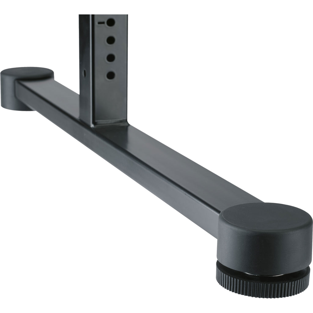 Its compact steel tubing construction and large round floor protectors make this attractive keyboard table significantly more stable. Two sided spring-loaded locking screws make precision height adjustment easy. The support arms can be adjusted to suit the size of the keyboard. When folded, the table is impressively flat. The design of the table complements keyboard bench 14085 or 14086. An optional extra is the 18813 attachment for a second keyboard or laptop. Use the adapter 18814 to mount the microphone boom arm 18956 or the music holder 18958 easily and quickly.
