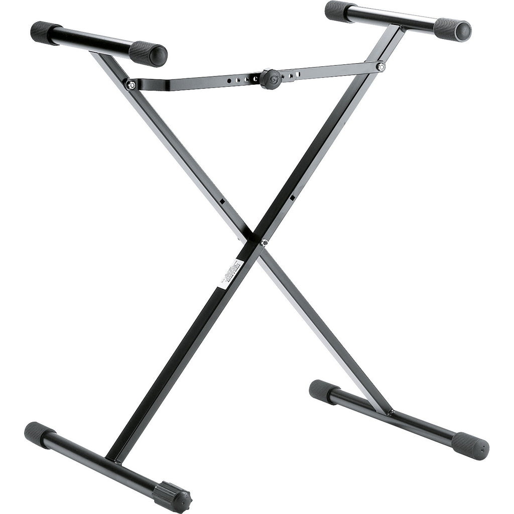 X-style keyboard stand, especially designed for children. Very low height-adjustable and easy to set up and fold. Unique adjustment mechanism insures the stand to open always to the desired height and width. Slidable non-marring pads on the support arms provide a firm fit also for smaller keyboards.