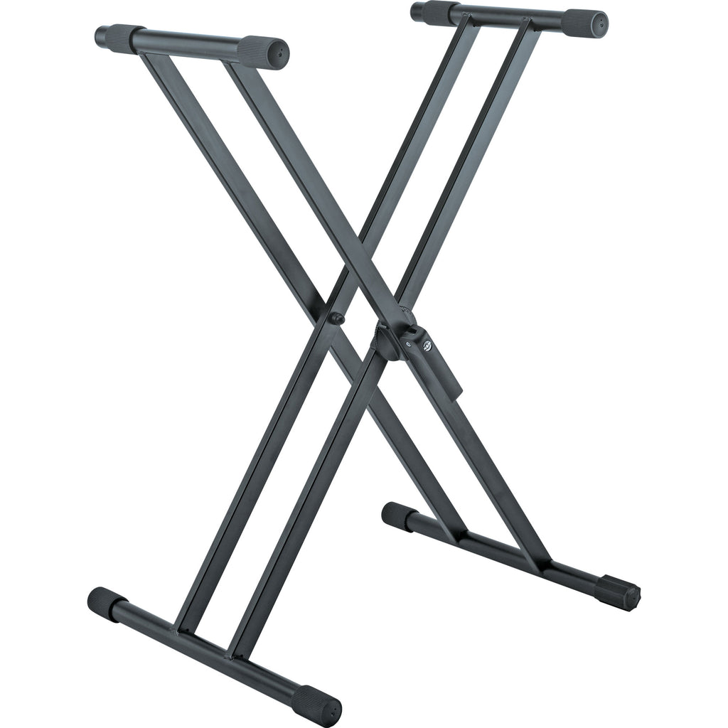 Heavy-duty adjustable steel construction with double square tubular cross supports. Patented push-button quick-release mechanism for easy operation. Non-marring pads on support arms. Will accommodate second keyboard with optional stacker 18941. Adjustable end cap to stabilize the stand on uneven surfaces.