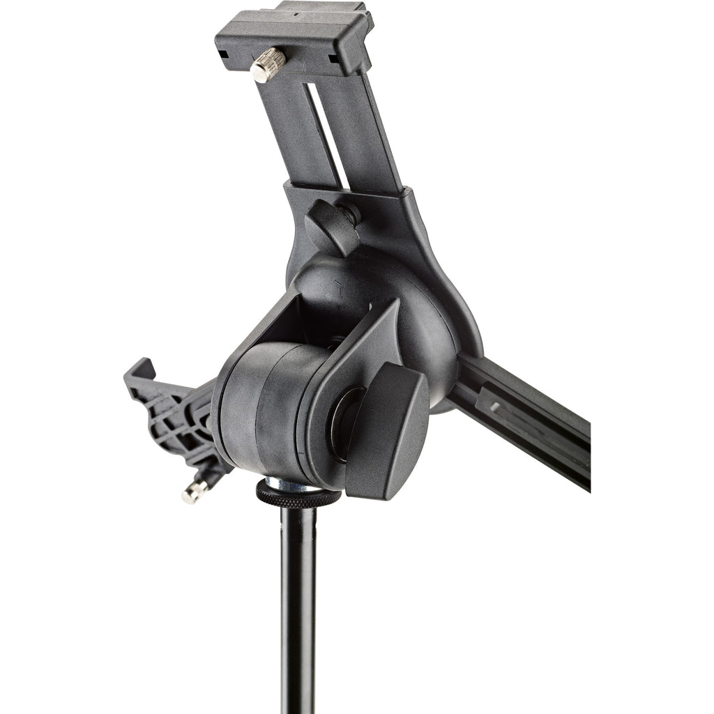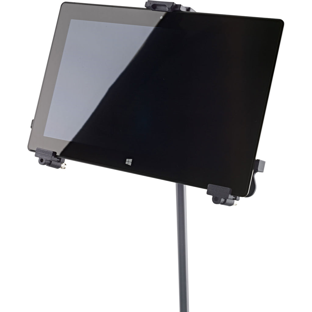 Give your Tablet devices a safe and secure hold: The Universal Tablet Holder can be adjusted variably to accommodate different tablet sizes without needing tools and holds the devices securely and effectively for many different situations. Be it on stage, in rehearsal rooms or at home - thanks to the 3/8" female thread the holder can be attached to for example any microphone stand quickly and simply. The individually adjustable support arms can accommodate the use of tablets ranging in height from 8.7 to 13.1 in and width from 5 to 9.1 in (for example iPad, iPad Air, iPad Pro, Amazon Fire HDX 8.9, Samsung Galaxy Tab from 9.7, Google Nexus 9, Asus Transformer or Microsoft Surface as well as Surface Pro). The depth of the tablets can vary between 0.2 to 0.4 in. For the first use of the tablet holder the support arms settings are made by adjusting the clamp screws to the size and depth of the tablet. For other uses the tablet can be attached and detached quickly and simply through a snap lock. This provides maximum flexibility and mobility. A handy wing nut allows one to adjust the angle, so that each user will easily be able to find their ideal individual position. The tablet can switch between portrait and landscape positions. The tablet is kept in place, there is no danger of the tablet switching position by itself.