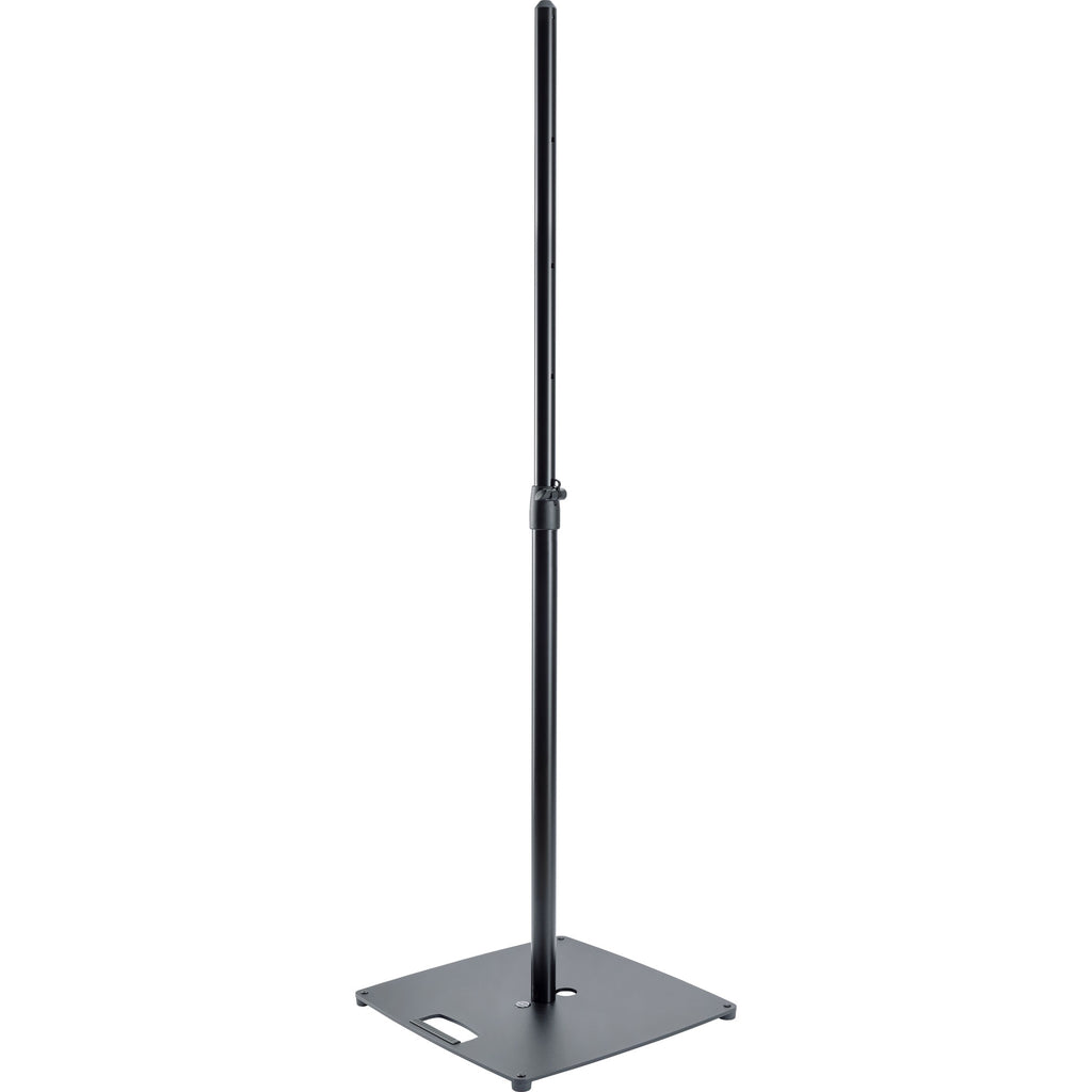 Attractive speaker stand with flat steel plate (19.251 x 19.251"), useful carrying handle and cable management. The stand is ideal for use where space is at a premium. The height is fixed with a safety hook and secured with a low-noise, backlash-free clamping screw. The slim design of the clamp enables space-saving transportation and ensures a stylish appearance. The usable height is between 43.7 and 71.259" and is adjusted in 4 steps of 6.889". The maximum load capacity when fully extended is 77.161 lbs.