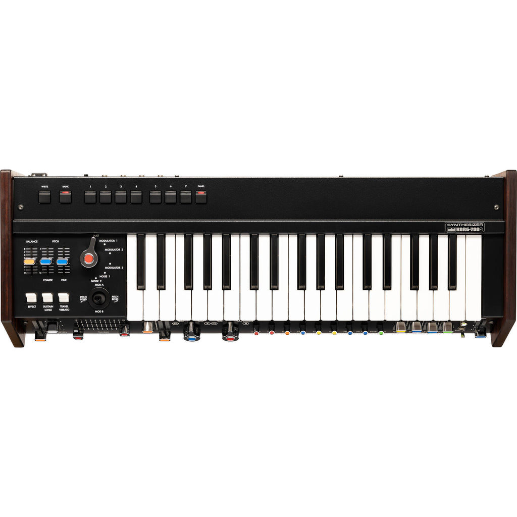 The controls on the miniKORG 700 were laid out below its keys in a row, allowing players to easily access them when the instrument was placed on top of an organ. This intuitive layout remains unchanged, offering simplicity, ease of use, and a unique look that sets it apart from any other instrument.