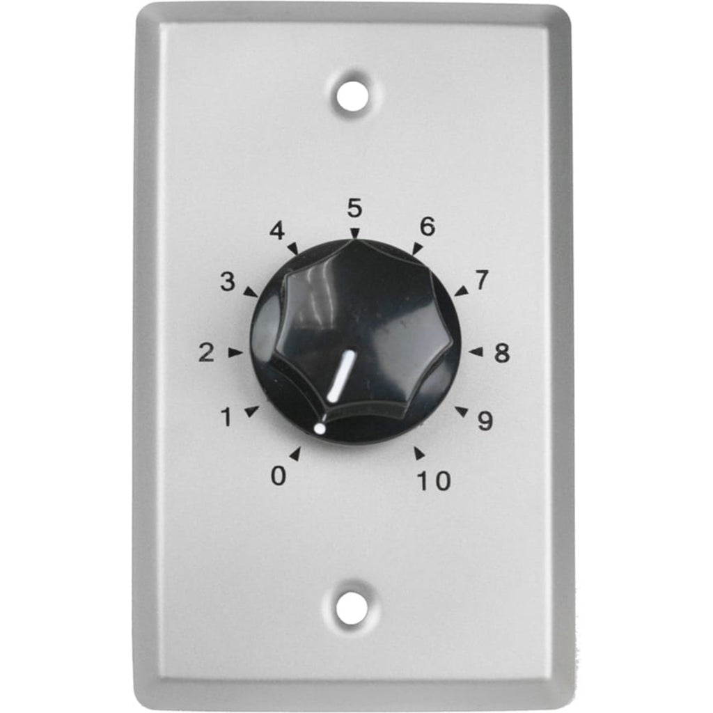 10W autoformer attenuator (volume control) with 3dB steps for use with 100/70/25V speaker line. Includes 1-gang stainless steel wall plate with rotary knob.
