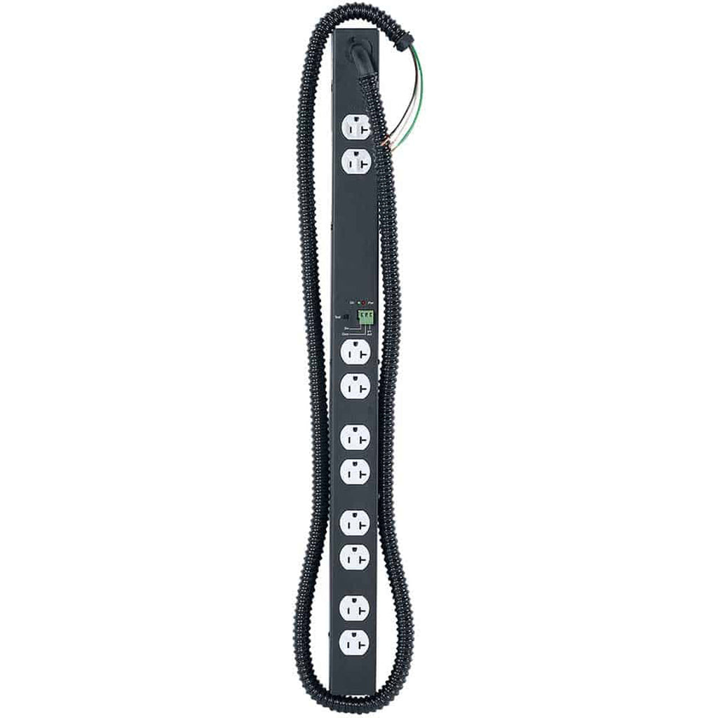Power strip features 10 outlets (5 NEMA 5-20R duplex with 4 switched, 1 unswitched), Remote Power Control terminal and mult-mount brackets. Strip terminates to flexible (non-metal) conduit with pigtail leads at the end and a rotating connector on the chassis. Conduit length is 6-foot and may be easily trimmed in the field to meet wire looming needs.