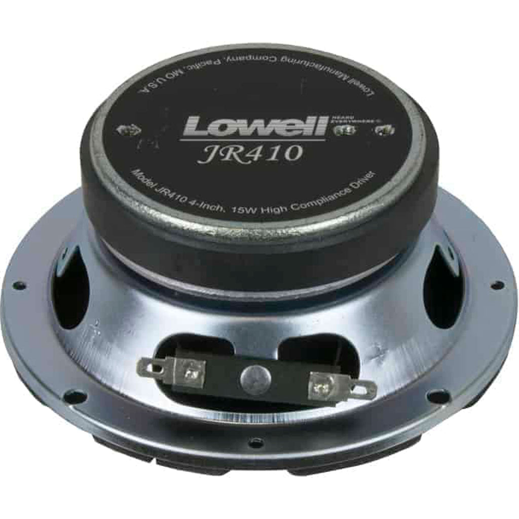 Lowell Model JR410 is a commercial industry standard 4" (EIA 5") speaker. that features a 10 oz. magnet for high power handling and sensitivity. It includes a 1" copper voice coil, plated steel basket, and high compliance treated cloth surround and is specifically engineered to provide wide frequency response and wide dispersion for solid performance in paging and background music systems. It's specified for reliable performance in commercial, industrial, and institutional applications including offices, public buildings, airport corridors, educational and medical facilities. The driver's small size and broad beamwidth of 170-degrees make it especially useful in rooms with low ceilings. The loudspeaker frame is stamped 20-gauge steel with a zinc-plated finish to prevent corrosion. For versatile application, the speaker is available with a selection of factory-wired transformers and will fit all standard 4" ceiling grilles and backboxes. Models with a factory-wired transformer have the transformer mounted directly to the top of the magnet. Made in the USA. Meets or exceeds all applicable EIA standards.