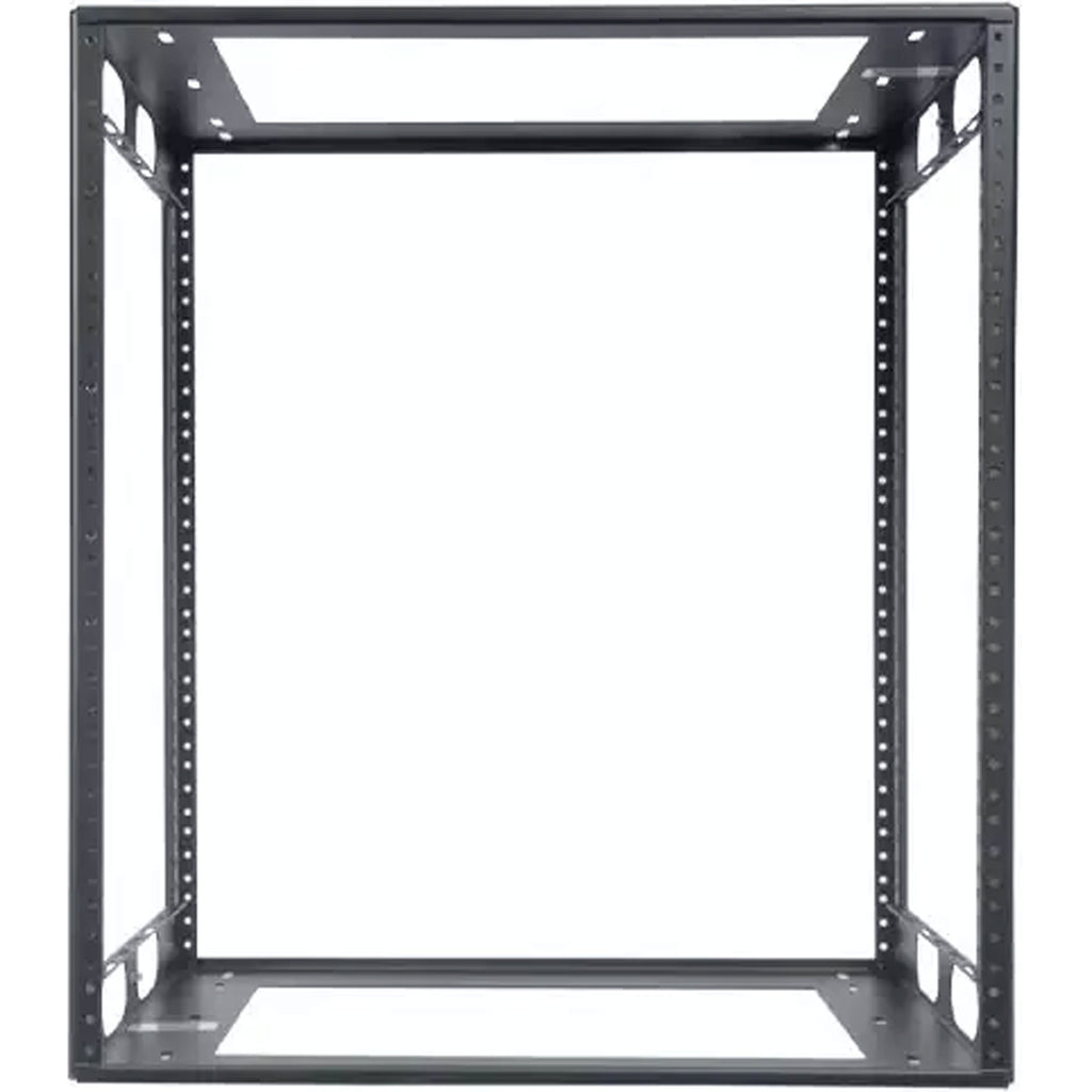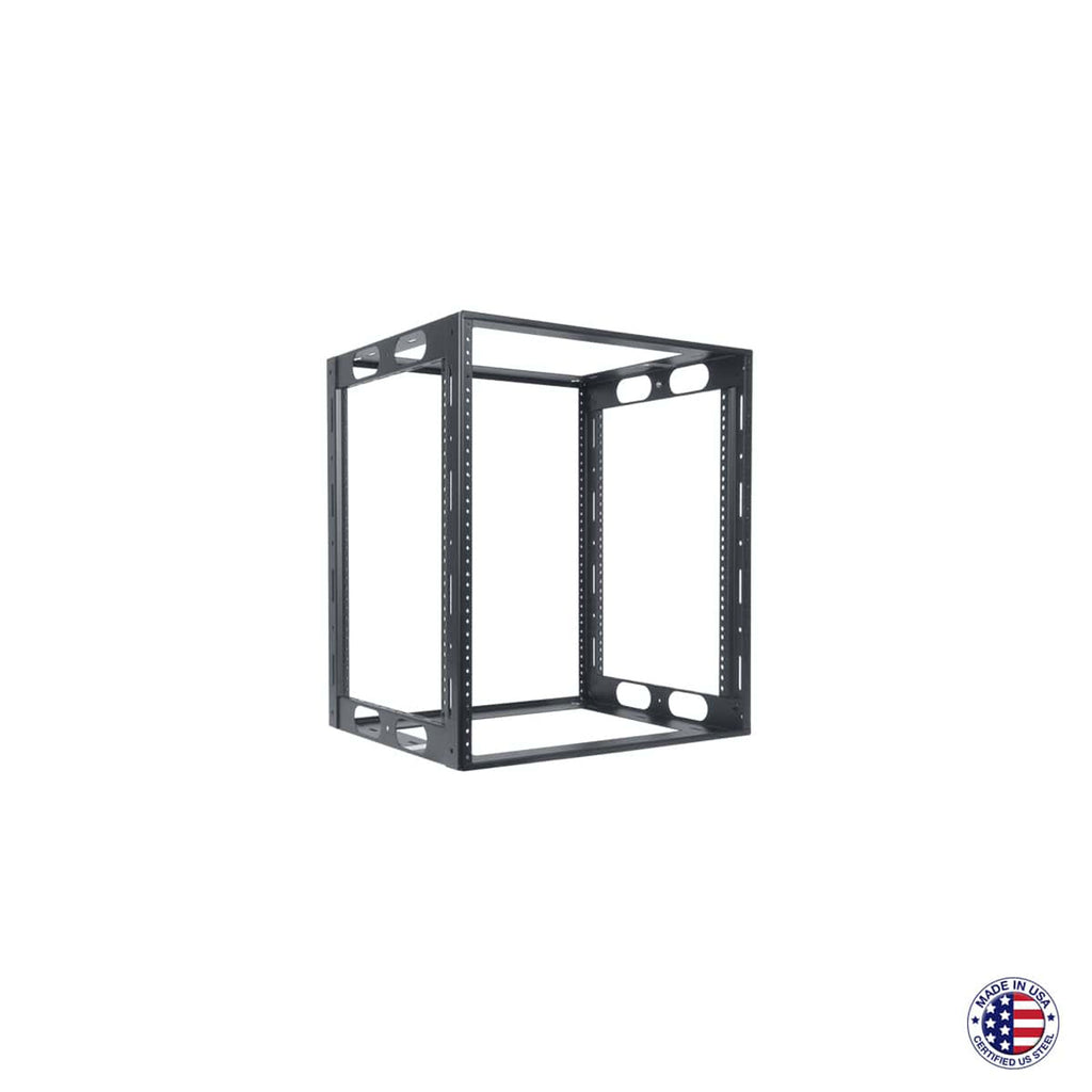 The welded credenza rack is a versatile, low-height and shallow-depth rack that's engineered specifically for mounting electronics into credenza style cabinetry, under counters and other built-in or freestanding rackmount applications. The 19"W EIA rack is precision formed and fully welded to provide rugged support, torsional rigidity and labor saving field installation. The rack is symmetrically engineered with a universal top and bottom that is fabricated from 14-gauge certified US steel. Top and bottom have a 12"W x 9"D opening, 1/4" diameter hole in each corner and slots left and right for anchoring/positioning. Front and rear corner post rails are 11-gauge steel tapped 10-32 on EIA spacing. Rack also has side openings that can be used as hand-grips for lifting rack into position. Following installation, side openings can be used for cable and wire management. Corner post rails are punched on sides to facilitate clean wire tie-off and bundling. Durable, semi-gloss black powder epoxy finish.