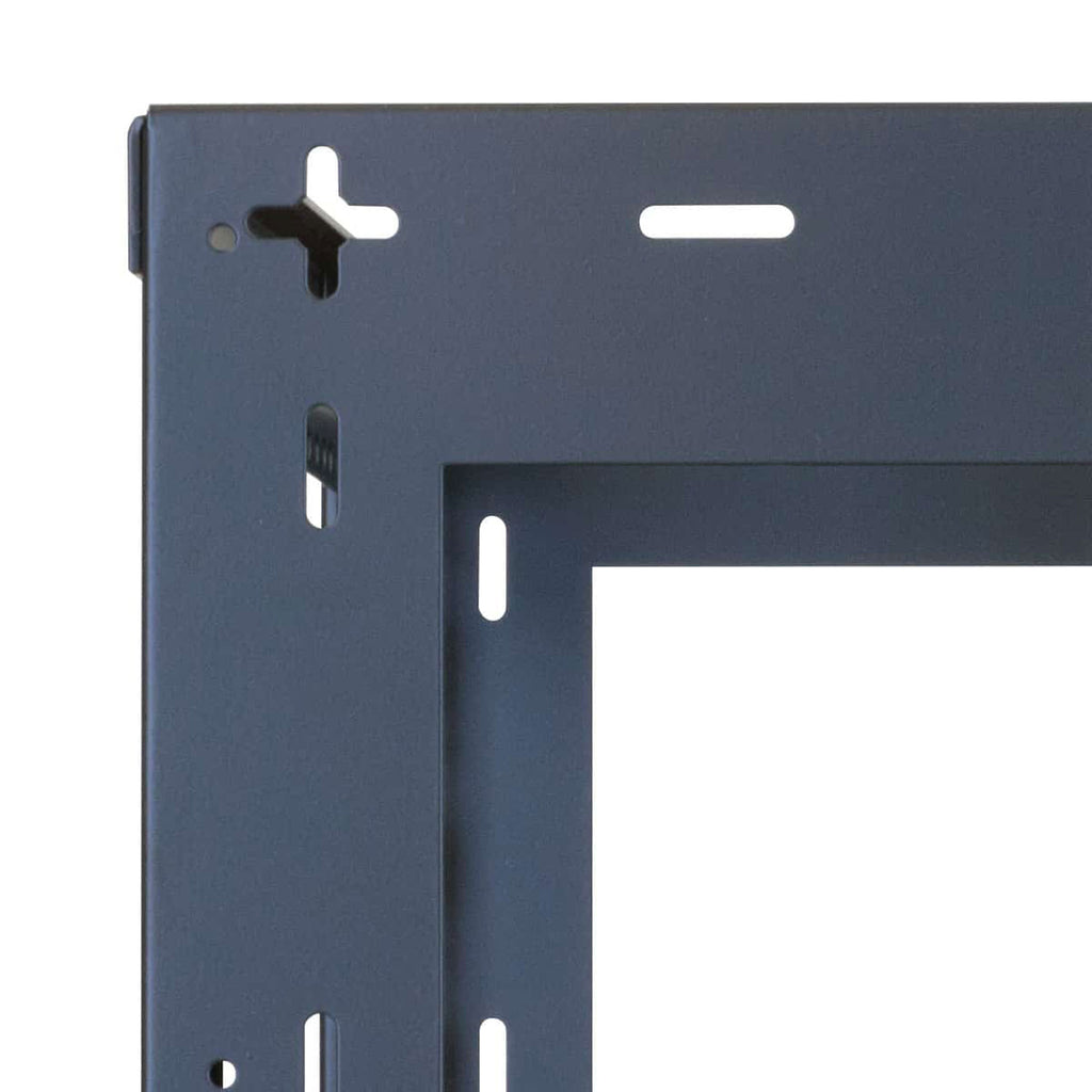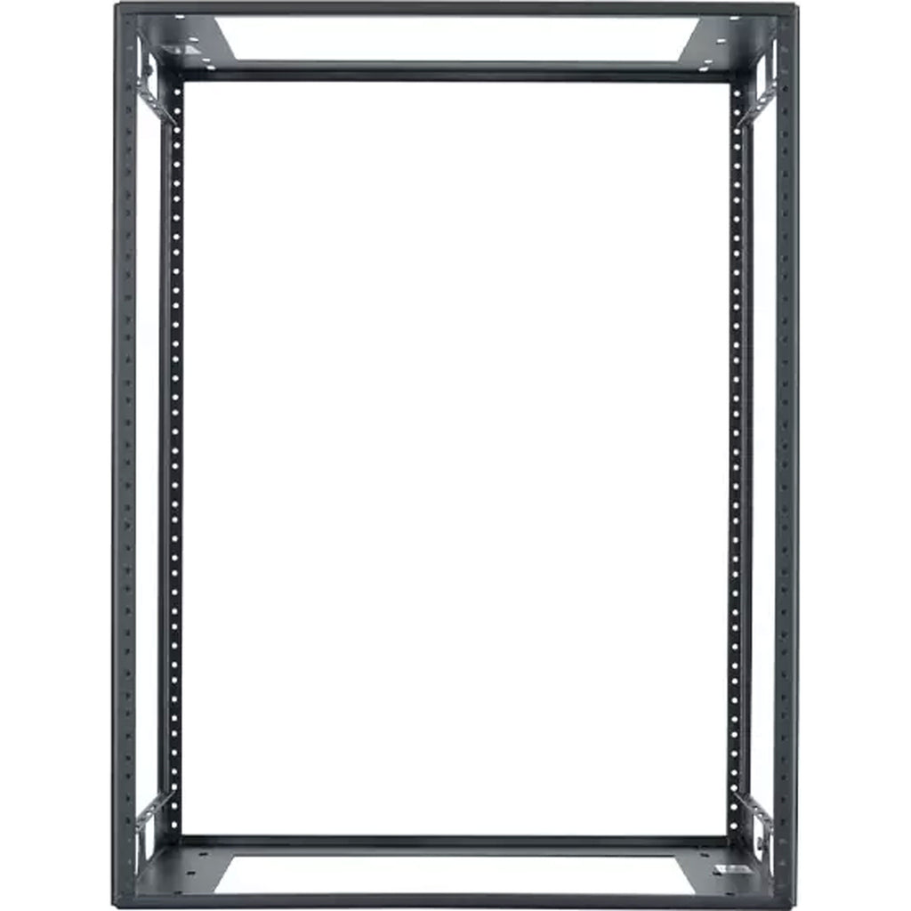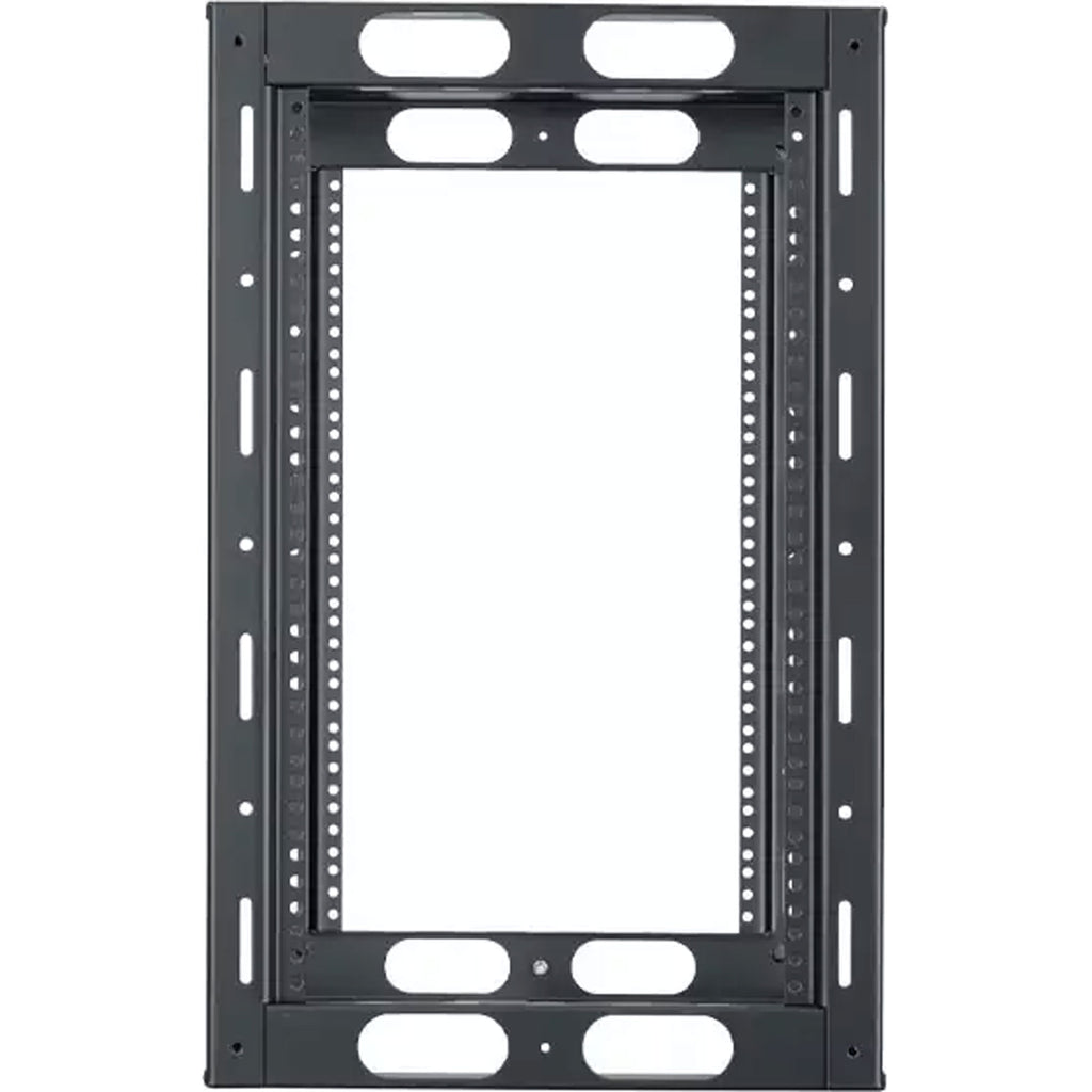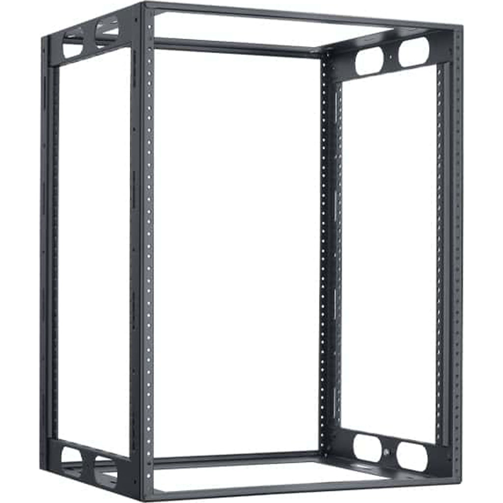 The welded credenza rack is a versatile, low-height and shallow-depth rack that's engineered specifically for mounting electronics into credenza style cabinetry, under counters and other built-in or freestanding rackmount applications. The 19"W EIA rack is precision formed and fully welded to provide rugged support, torsional rigidity and labor saving field installation. The rack is symmetrically engineered with a universal top and bottom that is fabricated from 14-gauge certified US steel. Top and bottom have a 12"W x 9"D opening, 1/4" diameter hole in each corner and slots left and right for anchoring/positioning. Front and rear corner post rails are 11-gauge steel tapped 10-32 on EIA spacing. Rack also has side openings that can be used as hand-grips for lifting rack into position. Following installation, side openings can be used for cable and wire management. Corner post rails are punched on sides to facilitate clean wire tie-off and bundling. Durable, semi-gloss black powder epoxy finish.