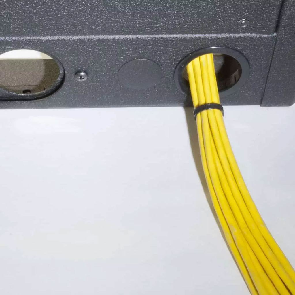 Plastic bushings are sized to snap into compatible holes along the sides of LGR Series gangable racks, making a smooth path to route cable bundles between racks. Black. Bag of 12.