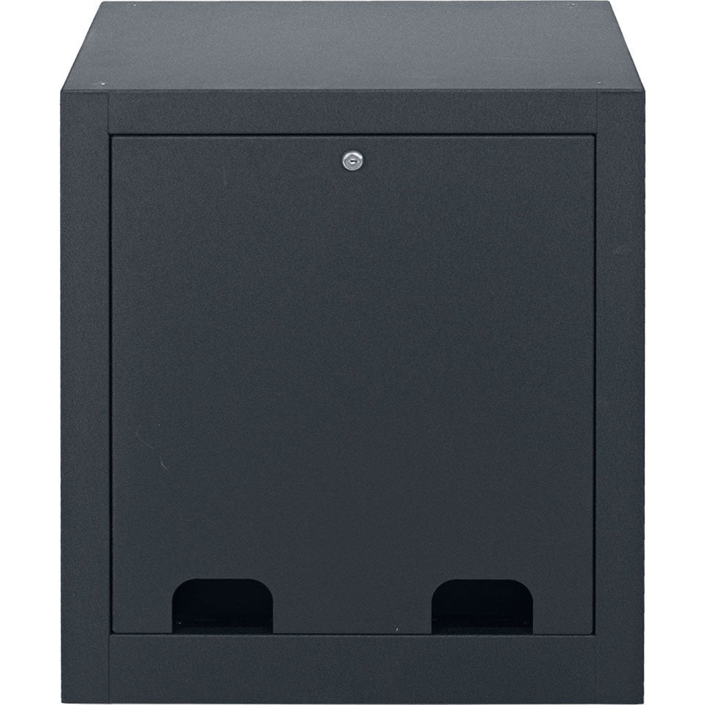 - Hideaway front door with vents and key-lock opens from top and slides into base for storage.