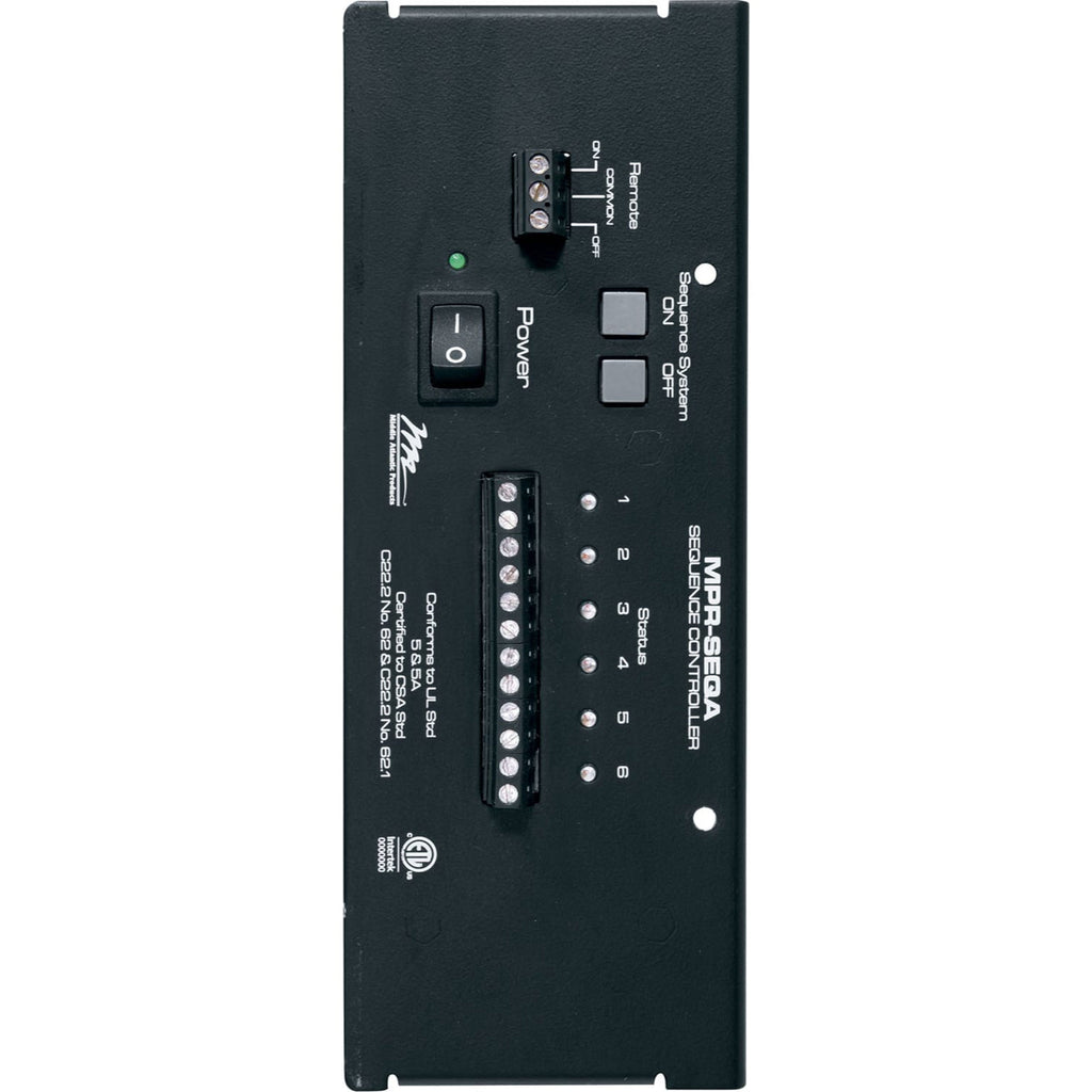 The MPR-SEQA is a 6-step power sequencing controller, designed to sequence contact closure-controlled devices such as the RLM power modules used in Middle Atlantic's MPR Modular Power Raceway custom power strip systems. The MPR-SEQ fits quickly and easily into any MPR raceway, features a two second delay interval between steps, and offers the added convenience of sequential restart functionality in the event of a power outage.