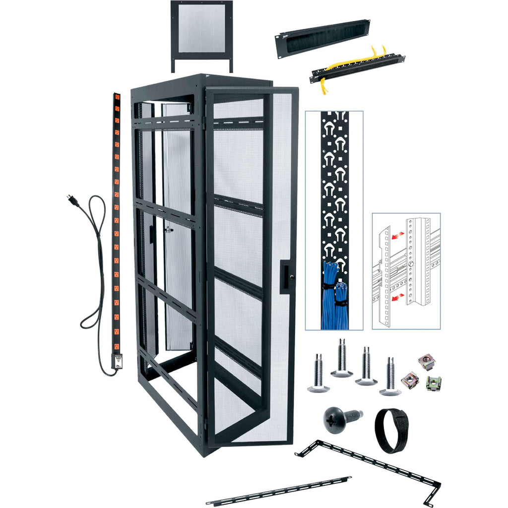 This kit features (2) pairs of 11-gauge threaded 10-32 rack rails with EIA spacing and labeled rack-space increments. It also includes (2) side panels, a fully vented top panel, a fully perforated vented front door, a split rear door, a vertical lacer strip, (6) horizontal lacer bars, (12) cable-management straps, a power strip with cord, (2) brush grommets, leveling feet, and all mounting hardware.