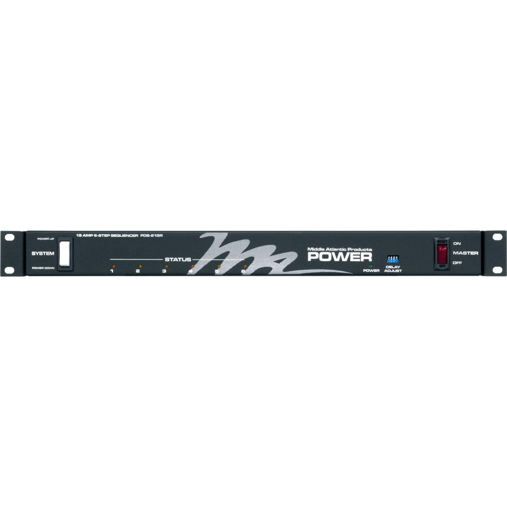 The Middle Atlantic PDS-615R Rackmount Power Sequencer 6-Outlet 15A has a termination with a 9' (274 cm) power cord and a NEMA 5-15P plug. It provides sequencing for six rear NEMA 5-15R outlets. The power sequencer's start delay times and sequence intervals are adjustable. The sequencer can be activated locally or remotely via a terminal block.