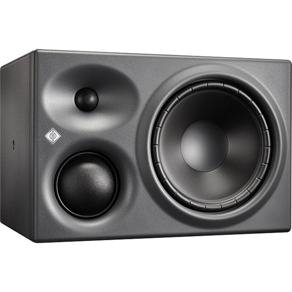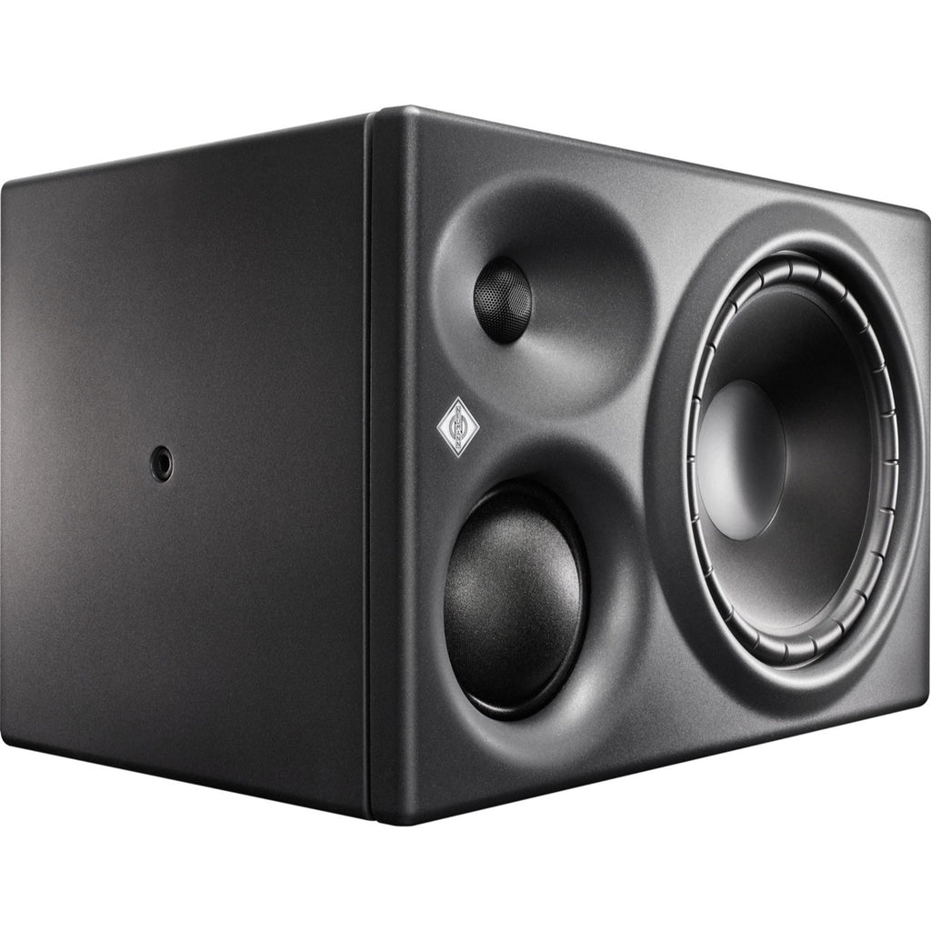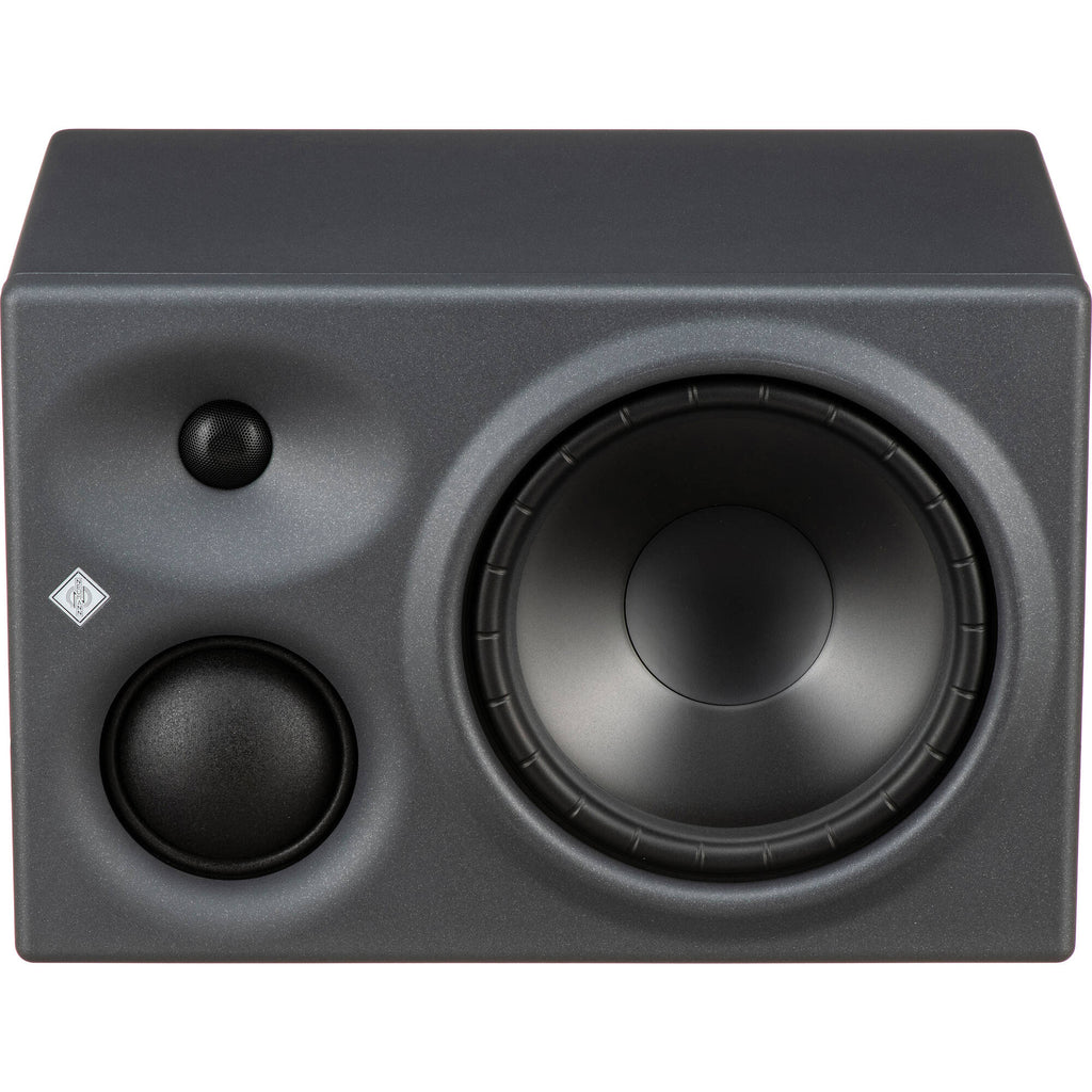 The left channel KH 310 Three-Way Active Studio Monitor from Neumann is a tri-amplified monitor capable of a total of 290-watts of continuous output. It is designed for use as a near-field monitor as well as in multi-channel systems as a front or rear loudspeaker, and can be used for tracking, mixing, and mastering applications. The KH 310 features a 8.25" woofer, a 3" midrange driver, and a 1" tweeter that are housed in a sealed, 3-way cabinet designed to reduce standing waves and assist in fast bass transient response.