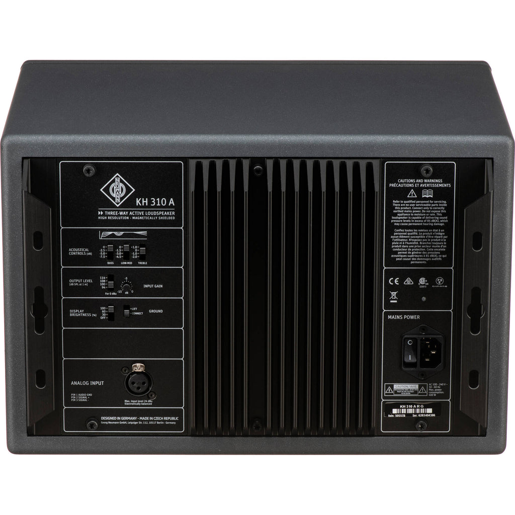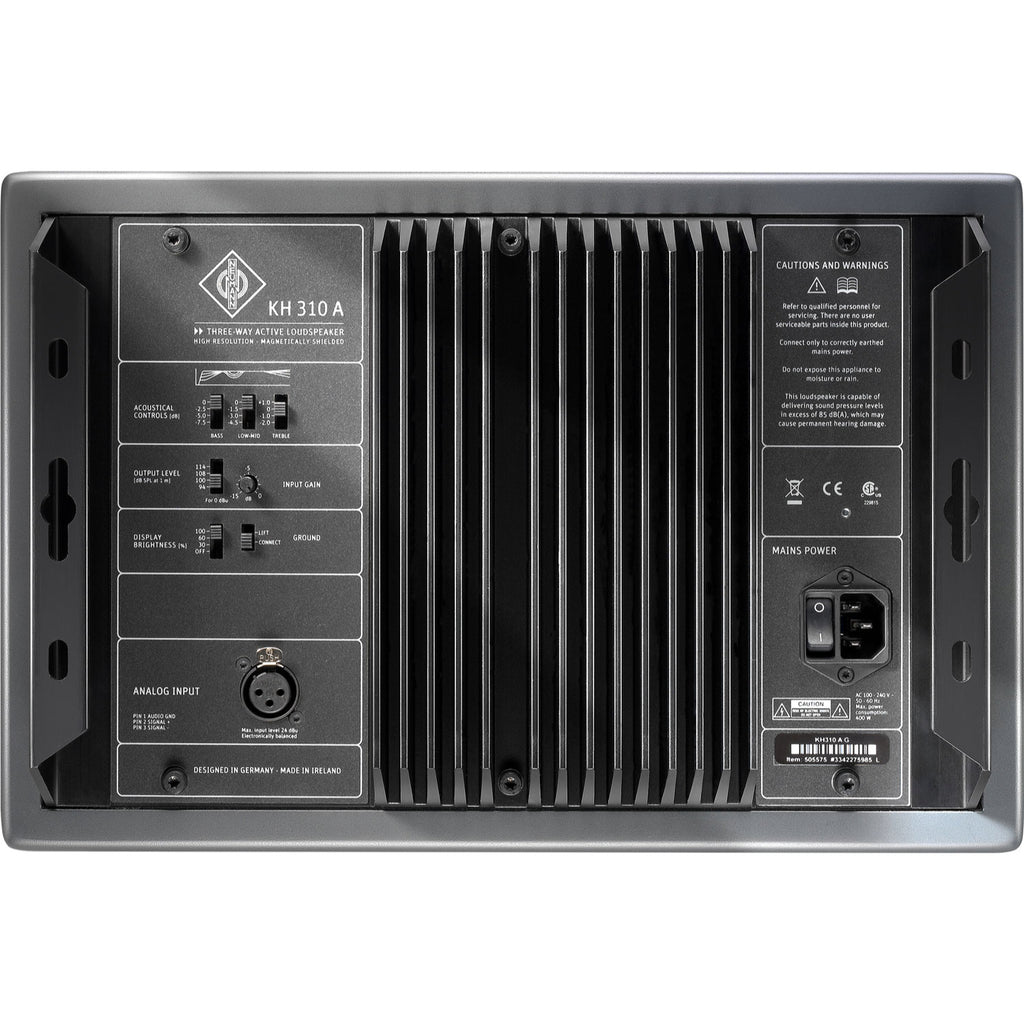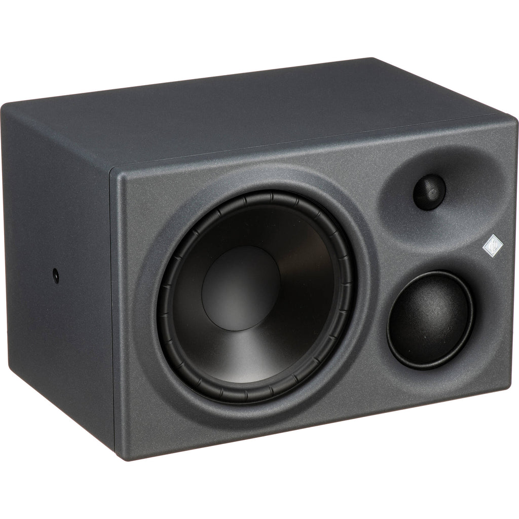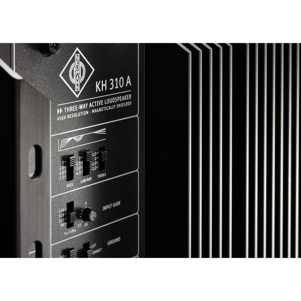 The right channel KH 310 Three-Way Active Studio Monitor from Neumann is a tri-amplified monitor capable of a total of 290-watts of continuous output. It is designed for use as a near-field monitor as well as in multi-channel systems as a front or rear loudspeaker, and can be used for tracking, mixing, and mastering applications. The KH 310 features a 8.25" woofer, a 3" midrange driver, and a 1" tweeter that are housed in a sealed, 3-way cabinet designed to reduce standing waves and assist in fast bass transient response.