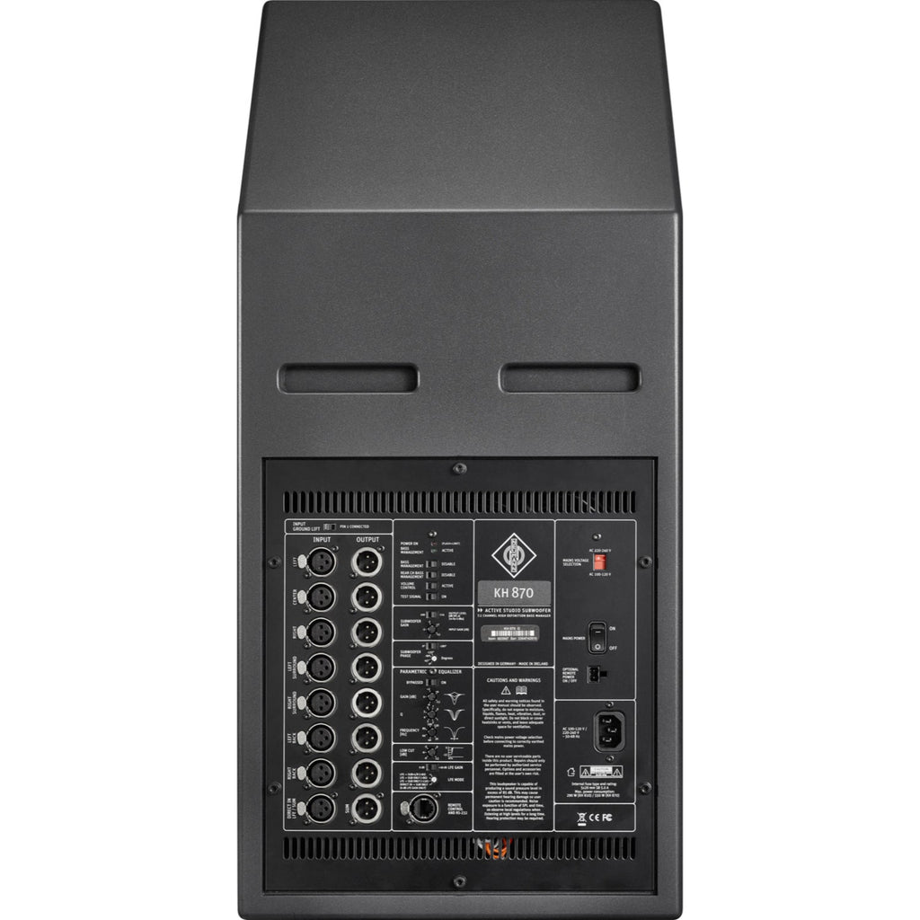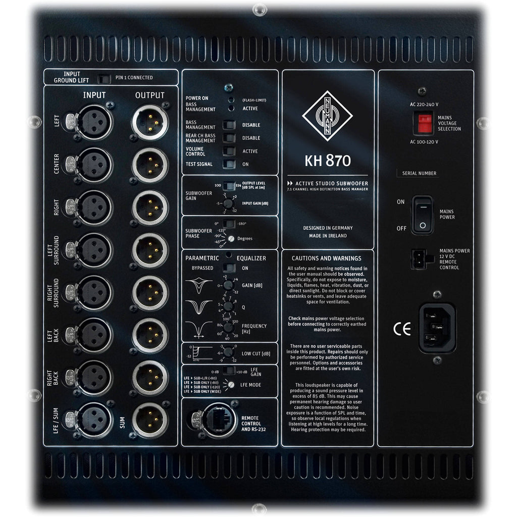 The KH 870 has 0 and +10dB LFE gain, as well as 4-mode LFE processing that includes LFE to sub and left/right, LFE to sub up to 80Hz, LFE to sub up to 120Hz, and LFE to sub with no filtering for daisy-chaining subwoofers and external signal processors. This guarantees compatibility across all formats and industry standards -