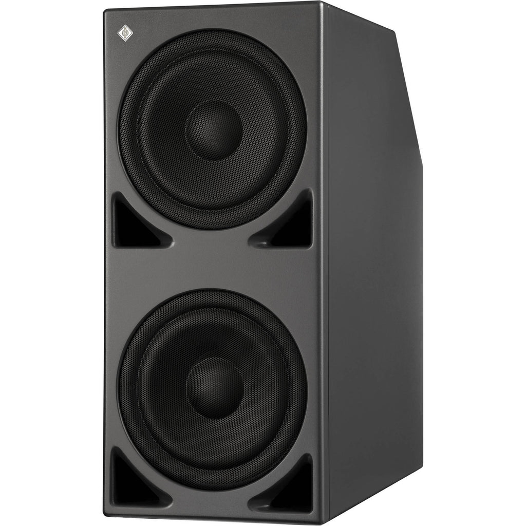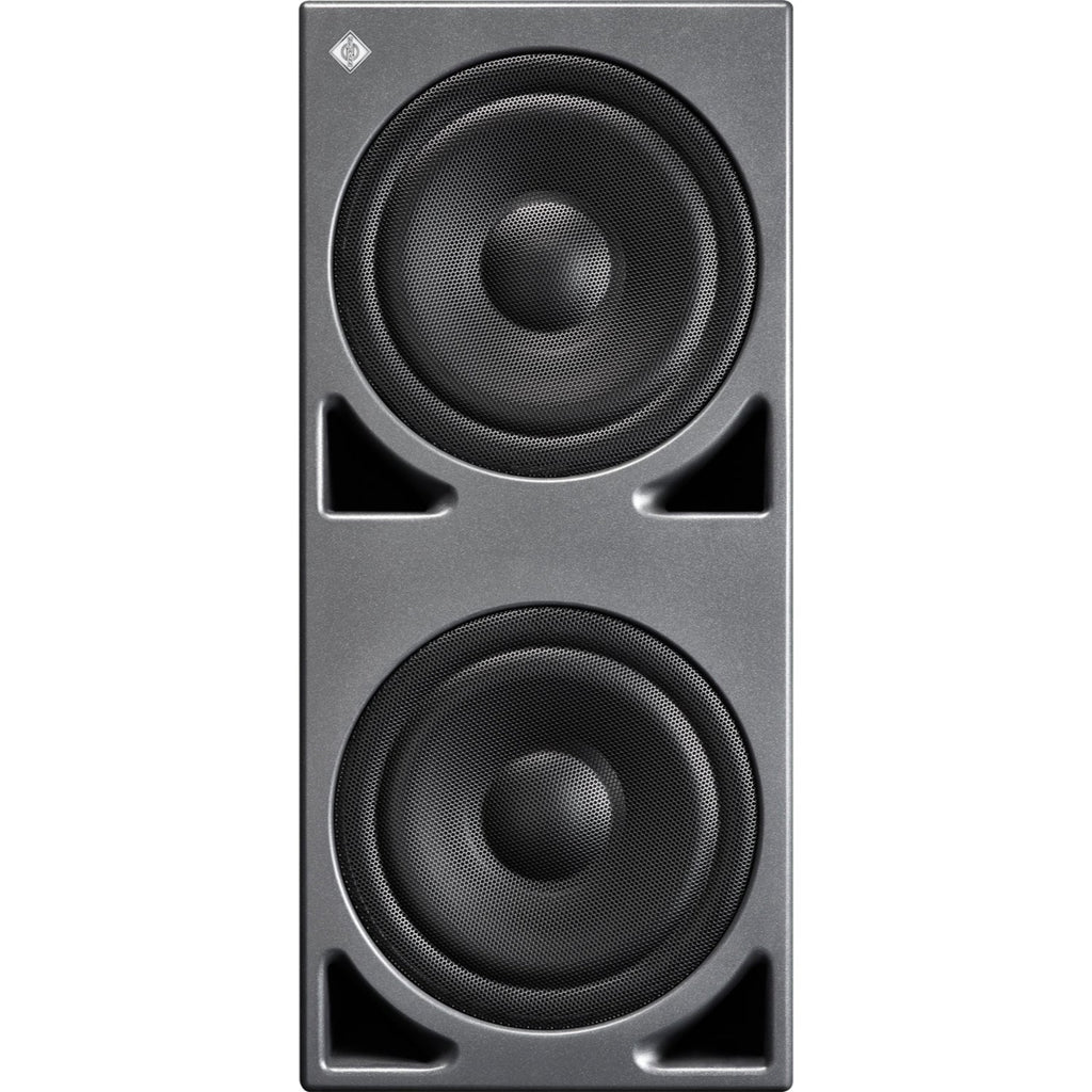 The sub has a sturdy cabinet with a pair of 10" front-firing woofers. Front-panel bass ports extend low frequency response while reducing compression and turbulence. Because the ports are on the front, you can also position the sub next to a wall or flush mounted into a wall without reducing performance. The sub can be used on its own, daisy-chained with other subwoofers to make a larger system, or used with Neumann full-range monitors for a full multichannel system.