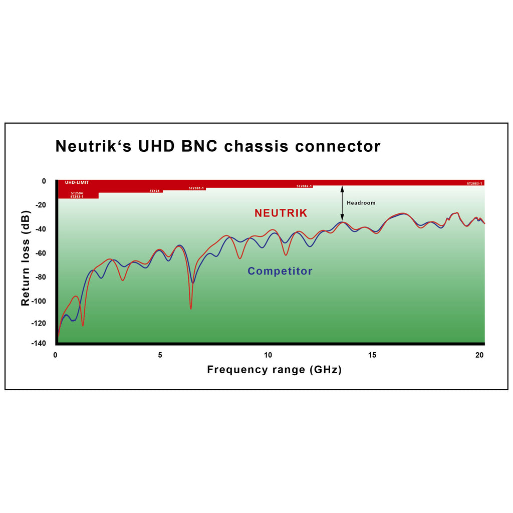 Due to optimized insulator design and reduced crimp diameter from center pin the Neutrik rearTWIST UHD BNC connector achieves increased headroom compared to conventional BNC connectors and offers additional return loss reserve for potential impedance deviations resulting from cable bending, incorrect connector assembly or faulty connection interfaces without signal interruption.
