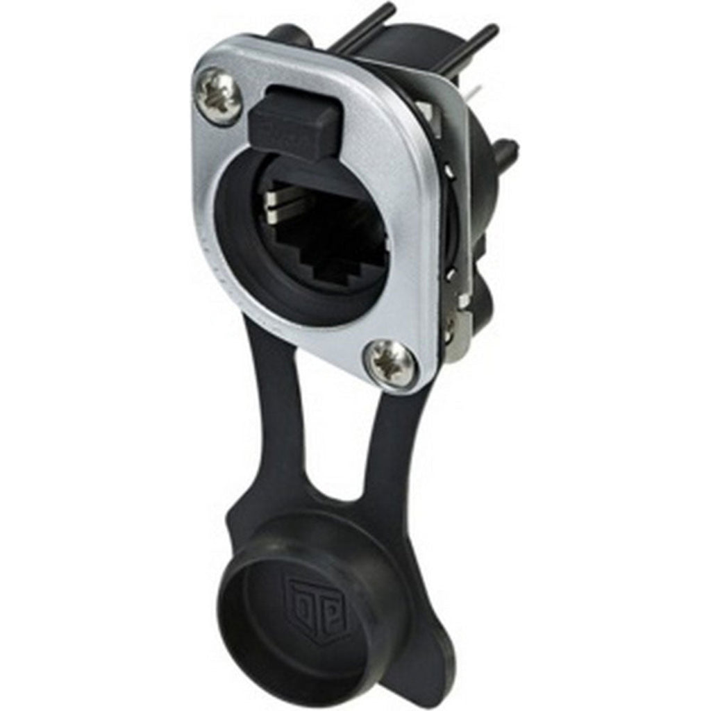 Vertical PCB panel mount RJ45 receptacle, combined with sealing kit SE8FD-TOP, max. panel thickness 4 mm, mounting screws included.