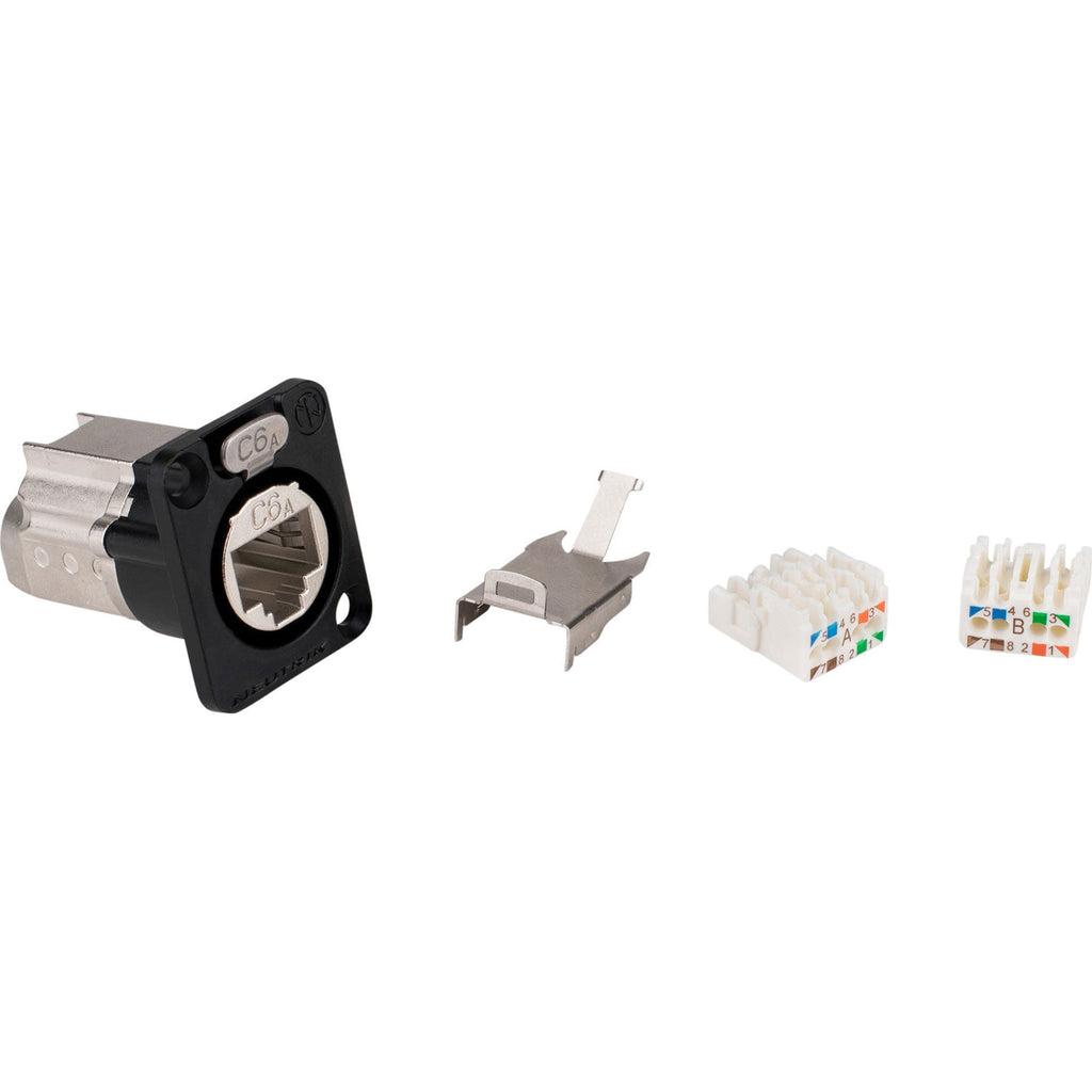 D-shape CAT6A panel connector, shielded, IDC termination, black housing.