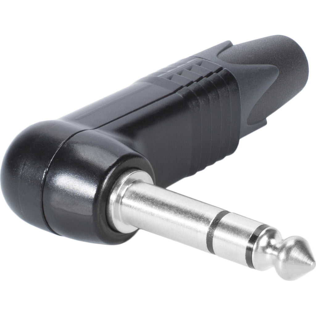 Male 1/4" Right-Angle TRS Stereo Phone Plug, Cable End, Black Housing, Silver Contacts