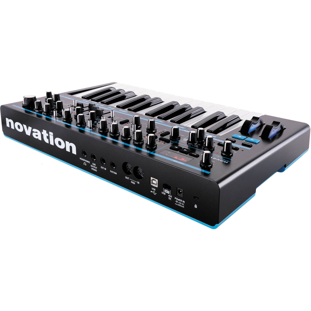 The Bass Station II Monophonic Analog Synthesizer from Novation is a 25-key synthesizer with assignable aftertouch that, while designed for bass synth sounds, is also capable of leads and arpeggiated performance. It features two analog oscillators as well as a third, sub-octave oscillator. The tones its oscillators produce can be modulated, shaped, and altered by the Bass Station II's Classic and Acid filters, dual ADSR envelope generators, 2 LFOs, and analog distortion.