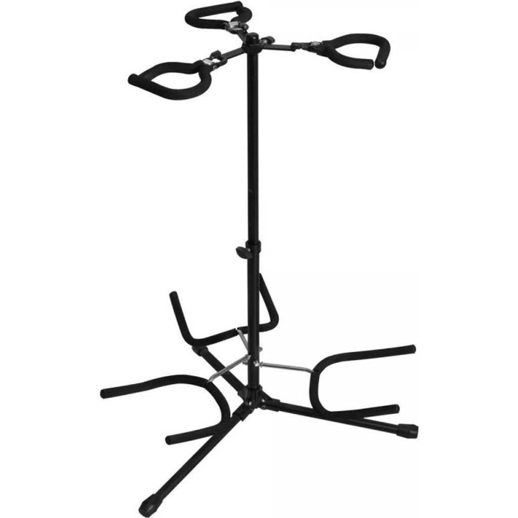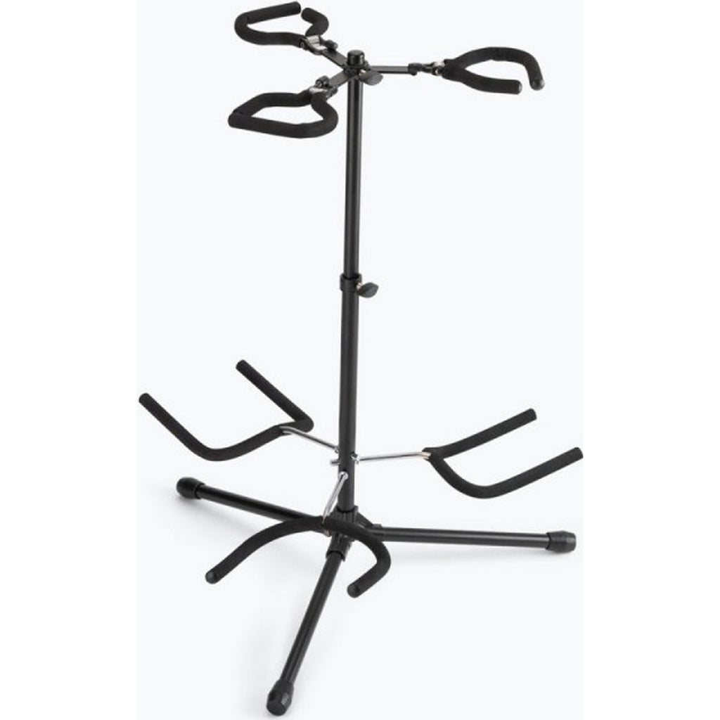 The GS7353B-B Tri Flip-It Guitar Stand holds three guitars in a compact footprint. Each upper yoke features a spring-loaded latch that closes itself around a guitar neck to prevent guitars from being bumped off the stand. For additional security, the lower yokes are angled back to keep guitars from tipping forward or falling. Padding on the yokes protects the guitar finishes while a wide tripod base provides stability and balance for dependable guitar support. For efficient storage and transportation, the base folds down and the lower yokes detach.