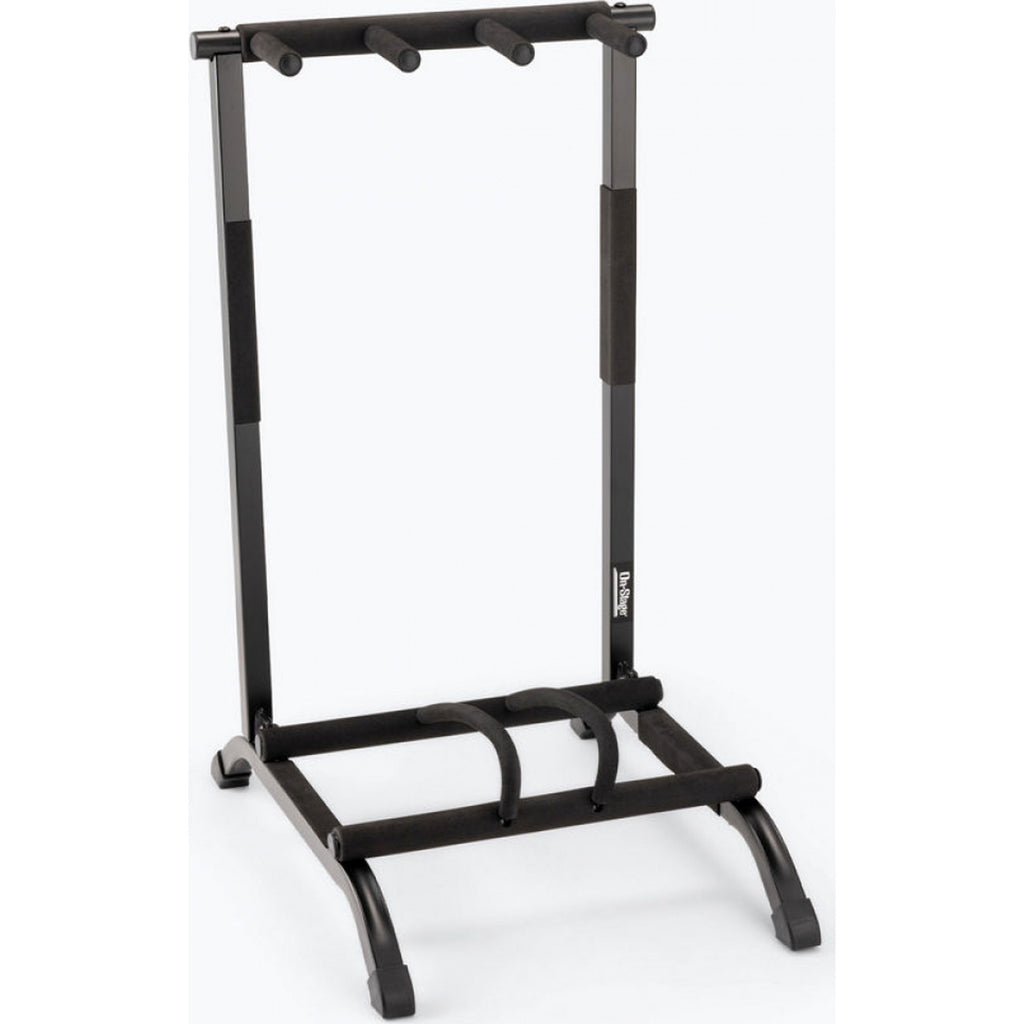 Great for gigs, our GS7361 Three-Space Foldable Multi-Guitar Rack provides all the benefits of a permanent guitar rack yet easily folds down for efficient storage and transportation. Up to three guitars are arranged single file for unobstructed access to each instrument. Dividers are included which can be added to the lower rails to ensure the guitar bodies don't bump into each other. All the guitar-resting points and dividers are padded to protect guitar finishes. The wide four-point base provides stability and balance for dependable instrument support. To keep up with ever-changing gear, this rack holds any of the following combinations of guitars: two acoustics and one electric, two electrics and one acoustic, or three electrics.