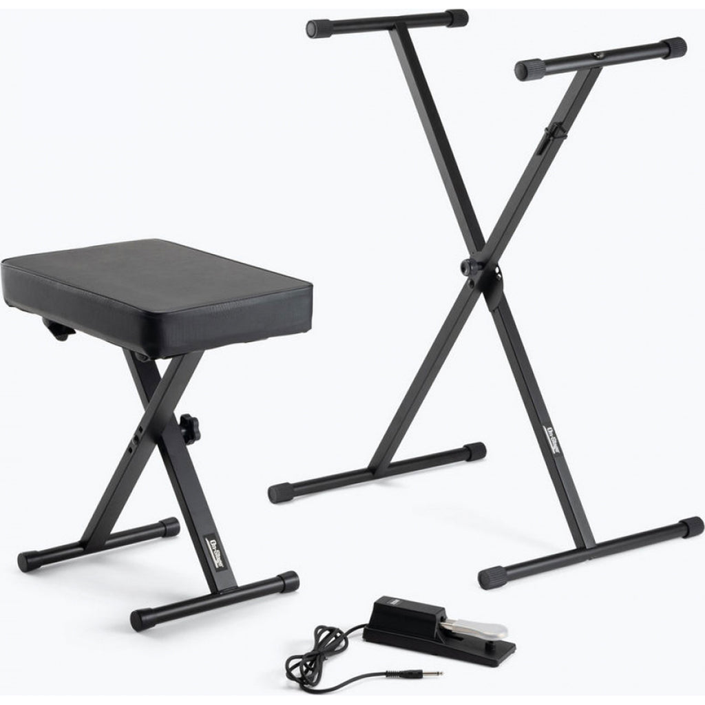 The KPK6550 Keyboard Stand and Bench Pack with Keyboard Sustain Pedal bundles three of our most popular keyboard accessories-an adjustable stand, a deluxe bench, and a sustain pedal-for an exceptional value. Our KS7190 Single-X Keyboard Stand provides a wide, stable base and slip-free support for small-format keyboards. This versatile stand adjusts in height and length to suit various keyboard sizes and playing styles and features adjustable nonslip arm sleeves to accommodate a variety of keyboard widths. The entire stand folds flat for convenient storage and transportation. Designed for ergonomic playing, our KT7800 Three-Position X-Style Keyboard/Piano Bench features a soft yet firm seat cushion that delivers outstanding comfort and support. The exceptionally stable base adjusts in height to accommodate a variety of playing styles. The base also folds flat for convenient storage and transportation. Our full-size, piano-style KSP100 Keyboard Sustain Pedal enables use of your foot to activate the sustain function on any electronic keyboard with a 1/4" sustain jack. Designed for ease of use and convenient set up, this pedal features an integrated 6' cable, removable nonslip grip for foot traction, and nonslip rubber feet to keep it in place on the floor.