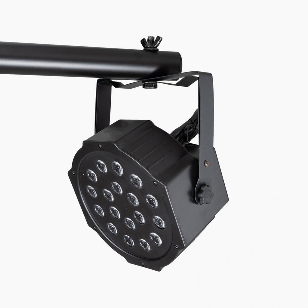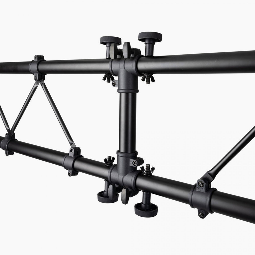 An efficient, secure way to erect and dismantle portable lighting, our LS7730 Lighting Stand with Truss adjusts in height up to 10.75', providing support for tall, complex lighting configurations. The center truss mounts eight PAR cans while two T-bars each mount four PAR cans, and hardware is included for mounting all 16 fixtures. Two stands with wide bases and nonslip feet provide exceptional stability and load balance for reliable performance even on irregular surfaces. For convenient, compact storage and transportation the light bars and truss sections detach and the tripod bases fold flat.