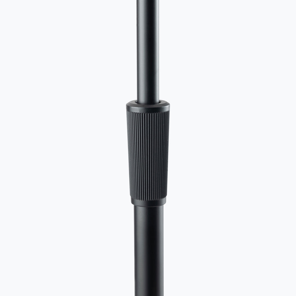 Our MS9210 production-grade mic stand with 10" round base features a heavy yet portable round base that delivers exceptional stability and withstands demanding conditions. Rubber feet on the base reduce vibrations and prevent slipping. The base connects to the shaft via a rugged M20-threaded lug, providing efficient assembly and reliable security. The shaft adjusts in height to accommodate a variety of miking applications and accepts booms, mic clips, and other mic accessories. The midpoint clutch offers extra protection for mics by acting as a brake on the upper shaft during height adjustment, preventing the shaft from crashing down.