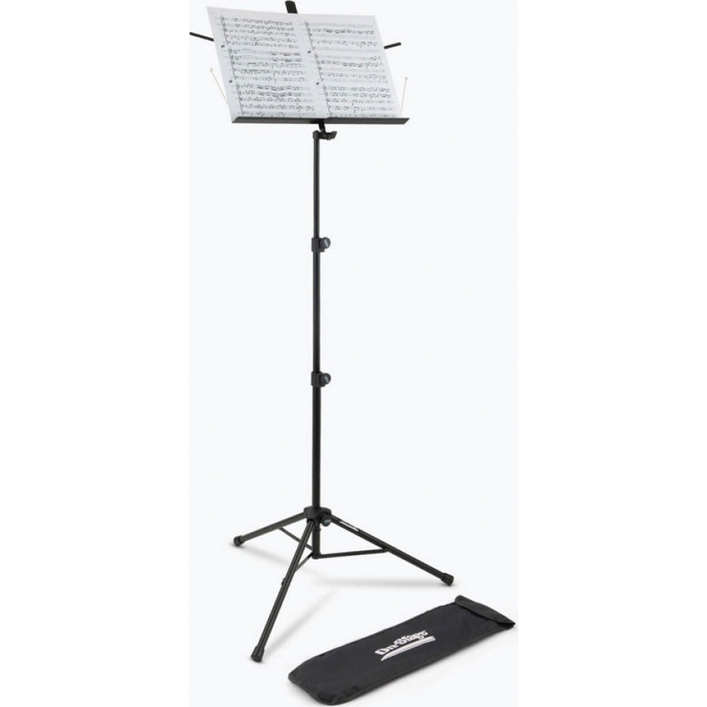 With an exceptionally stable foundation of three tubular legs, our SM7222BB Tripod-Base Sheet Music Stand with Bag delivers stable performance in a portable package. The adjustable height and tilt angle enable positioning for ergonomic viewing from a sitting or standing position. To reduce page turns, it displays three pages of sheet music side by side and secures them in place with fold-out arms. The bookplate and base fold flat for efficient storage and transportation. A protective bag with a snap closure and a shoulder strap is included for hands-free carrying.
