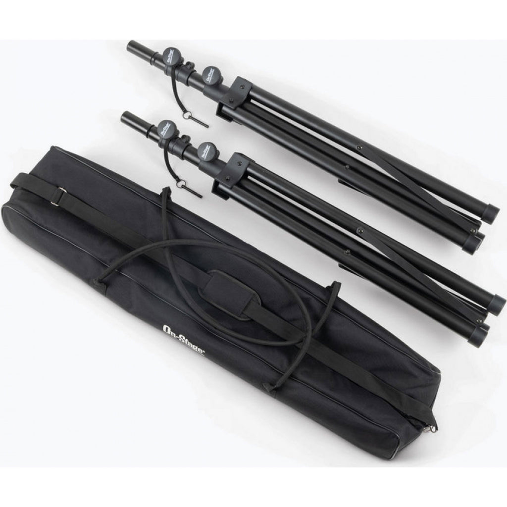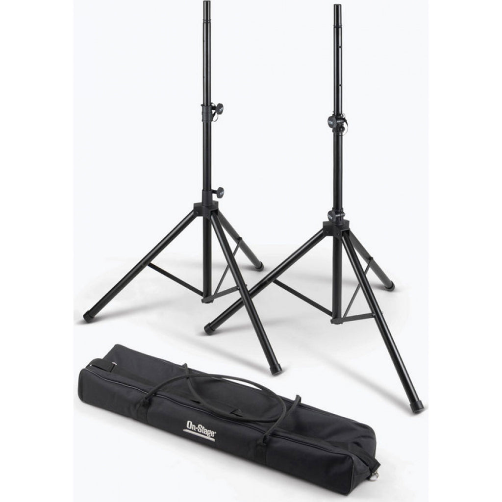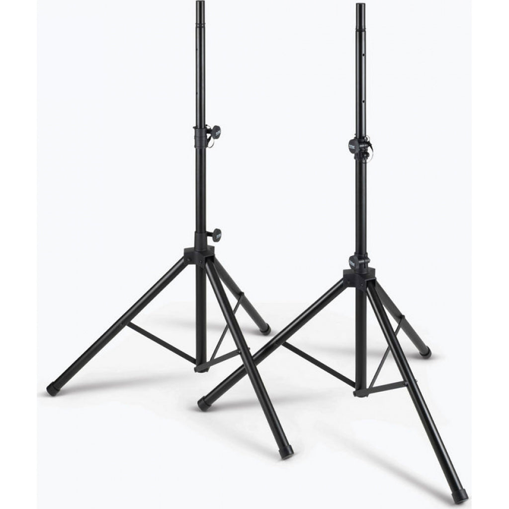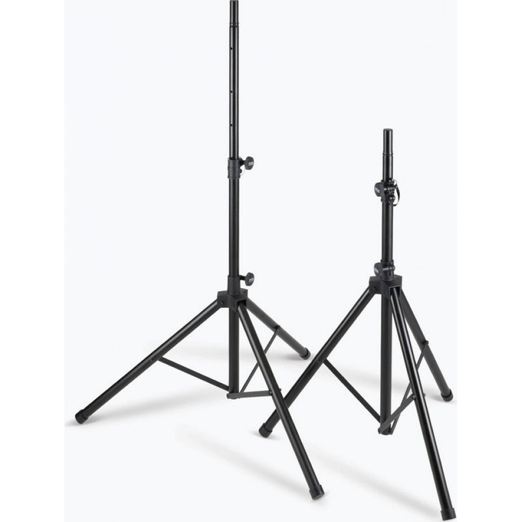 Our light-weight SSP7950 All-Aluminum Speaker Stand Pack comes with everything needed to support two speakers on individual stands. These light-weight stands feature versatile reversible poles that support all standard speaker cabinet mounting sockets and their height adjusts to accommodate a variety of applications. Heavy-duty construction, braced bases, and nonslip feet work together to deliver exceptional stability and load balance even on irregular surfaces. The durable black finish preserves the professional appearance of any space. For convenient storage and ergonomic transportation, the tripod bases fold flat and all the components fit into an included carrying bag with a shoulder strap and top handles.
