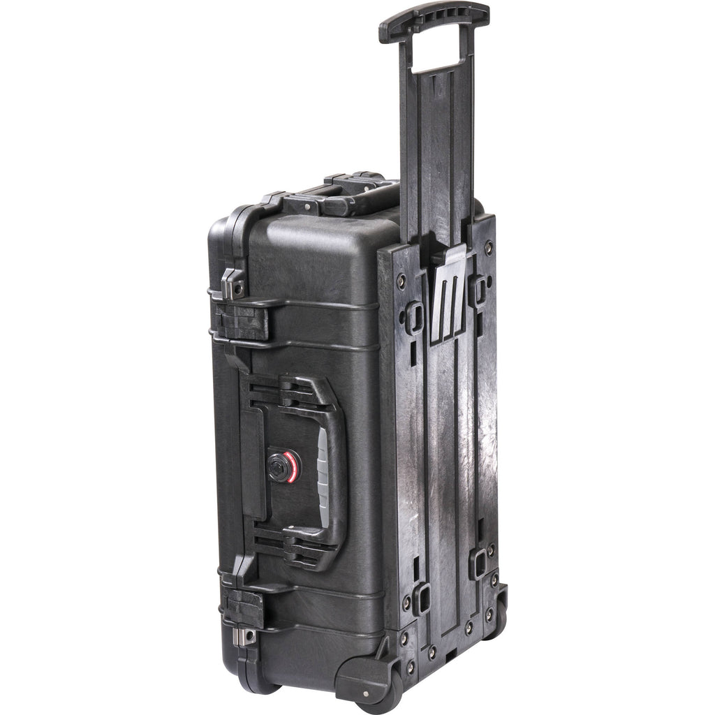 The 1510TP comes with long side handles, a long front handle, retractable extension handle, and strong polyurethane wheels with stainless steel bearings. It has an effortless release latch for the extension handle. The case meets current FAA requirements for carry-on luggage.