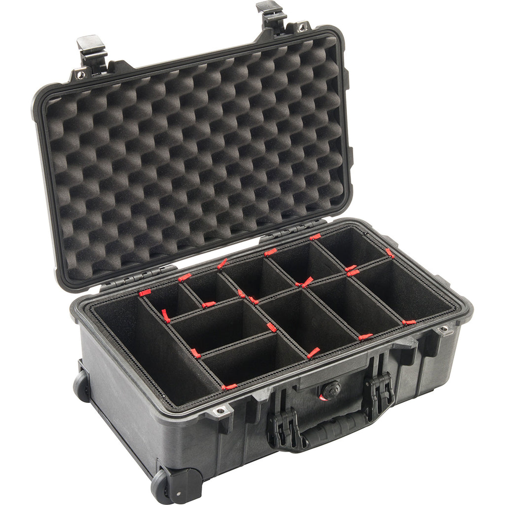 The black Pelican 1510TP Carry-On Case with TrekPak Divider System is an unbreakable, watertight, airtight, dustproof, chemical-resistant, and corrosion-proof hard case used to carry any kind of equipment that needs to be protected from the elements. It is made of an ultra-high impact structural copolymer that makes it extremely strong and durable. It has a 0.25" neoprene O-ring and includes an automatic purge valve for quick equalization after changes in atmospheric pressure. It has a hinged case with double ABS latches that seal perfectly, and padlock protectors that provide added strength and extra security against cutting and theft.