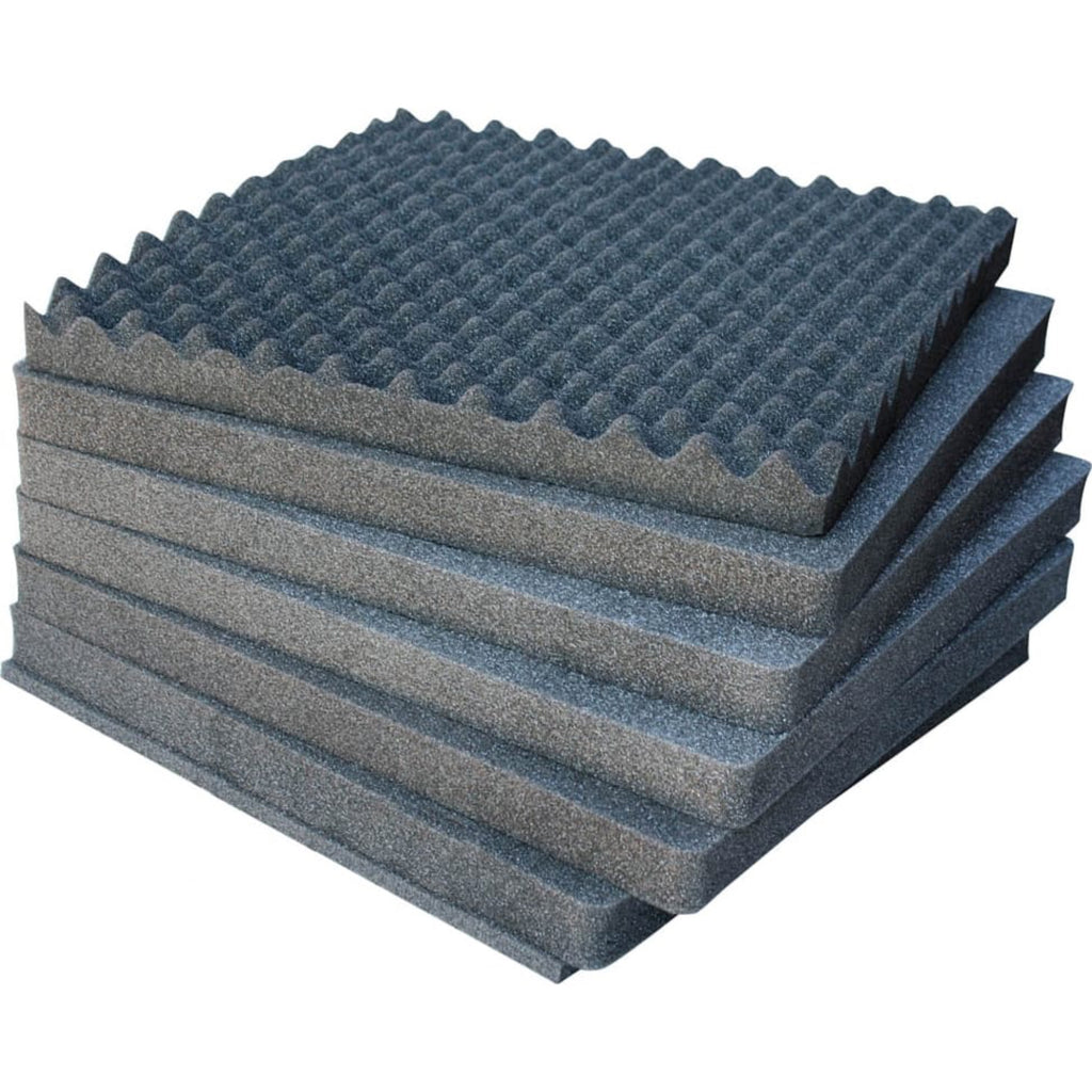 - Six-piece foam set contains one 0.63" base pad layer, four 1.78" cubed foam layers, and one 2.0" convoluted top lid foam layer