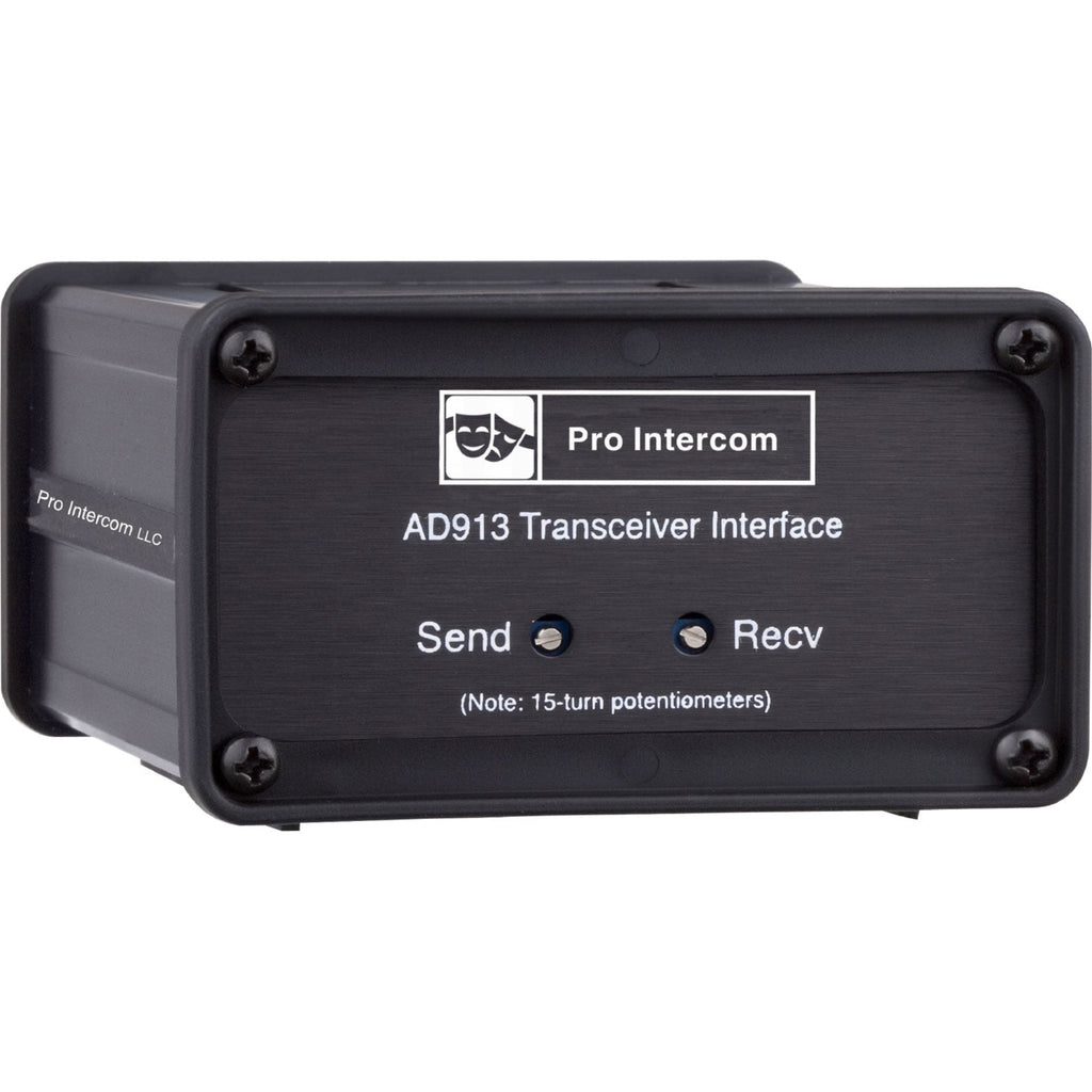 The AD913 is connected to the intercom system as is a belt-pack, via the female 3-pin XLR on the rear. The AD913 is powered by the intercom power supply. Connection to the (base) transceiver is made through a 6-pin male XLR, also on the back panel. Pro Intercom can provide connecting cables for most popular makes of transceivers. The front panel contains two 15-turn potentiometers for matching the send and receive levels of the transceiver to the intercom system.The input stage of the AD913 includes a studio quality microphone transformer. The output is also transformer isolated. Frequency response has been carefully shaped to optimize both intelligibility and long-term listening comfort.