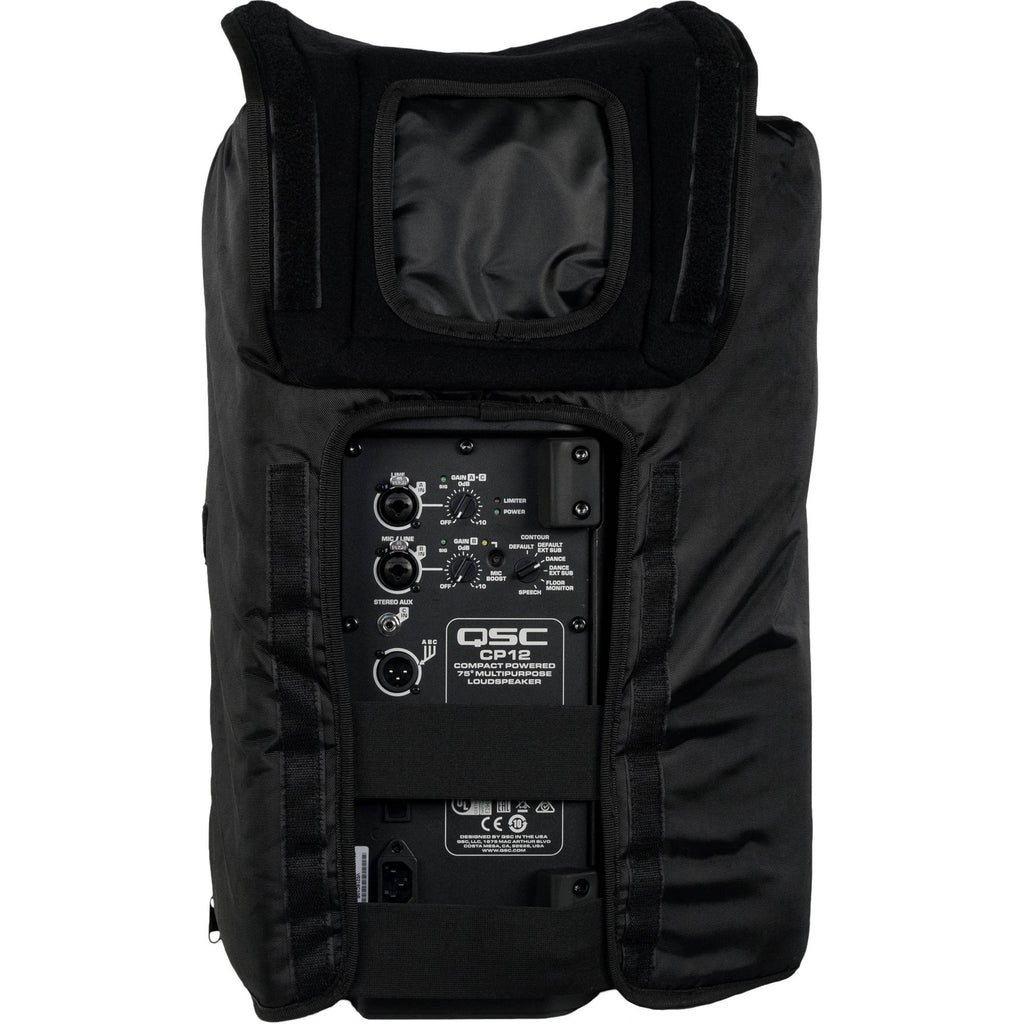 Nylon fabric and mesh cover for temporary outdoor use of CP12 powered loudspeaker in adverse weather. Removable amplifier panel allows access to connectors and controls. Vented panel maintains airflow for proper heat management. Not intended for permanent outdoor installations.