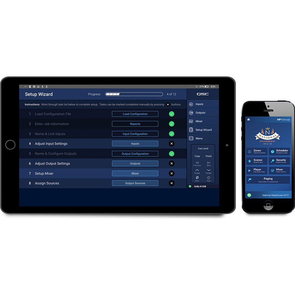 - Wired/wireless control options: Use optional MP-MFC wall-mounted controllers with graphic display to control zone source selection, zone output levels, input level selection and scene recall. MP Manage app expands these control options with wireless, more granular controls. In both cases, facility staff may be restricted to only those controls that they are authorized to use.