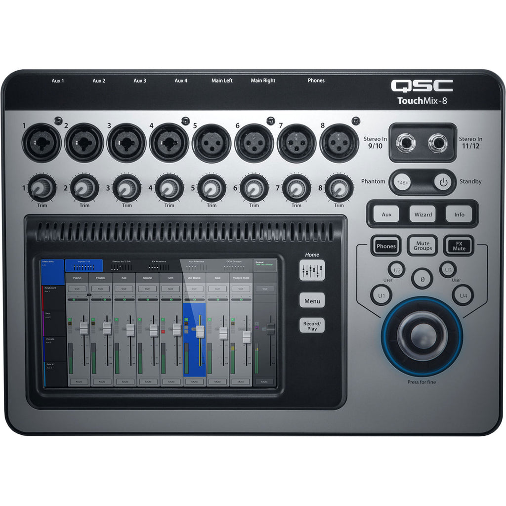 The TouchMix-8 Compact Digital Mixer with Touchscreen from QSC is a 12-input digital mixer that features 8 built-in mic preamplifiers and can be controlled by its integrated touchscreen or wirelessly via an iPad connected to the same wireless network. The mixer features a DSP-based 4-band parametric EQ with variable high- and low-pass filters, a gate, and compressor on each input channel. The TM-8's DSP also provides reverb, echo, delay, and chorus effects in addition to assignable pitch correction.