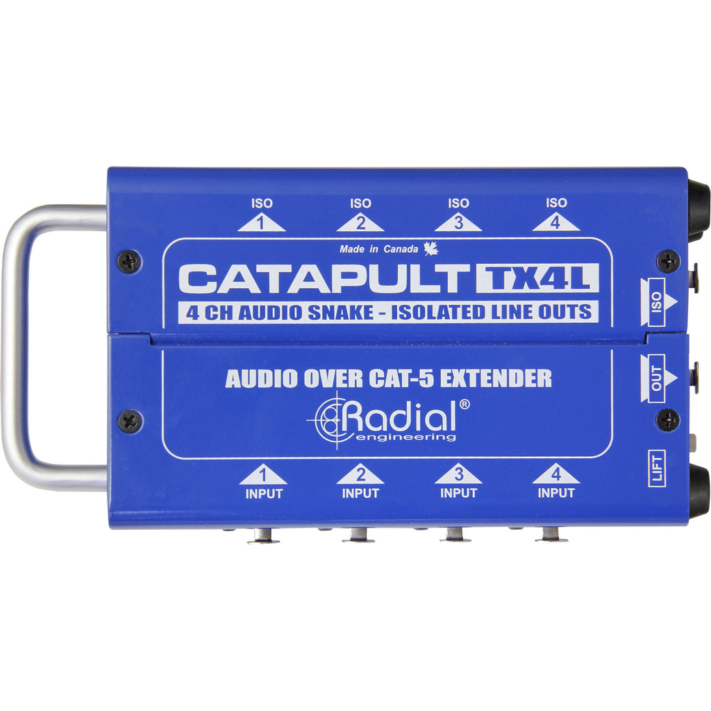 All of the Radial Catapult modules are compatible with each other, and each is sold individually, so you can select whichever combination best suits your needs. The Catapult RX4 and TX4 can be used together as a pair, creating a 4-channel audio snake. However, if you need transformer isolation to prevent hum and buzz when splitting audio signals, two additional models of Catapults are available. The TX4L and RX4L have line level isolation transformers for splitting playback tracks or outputs to amp racks, while the TX4M and RX4M can be employed when splitting mic signals on stage. Use any combination of these six models, along with the compact Catapult Mini RX and TX to create a custom snake designed for your unique application.