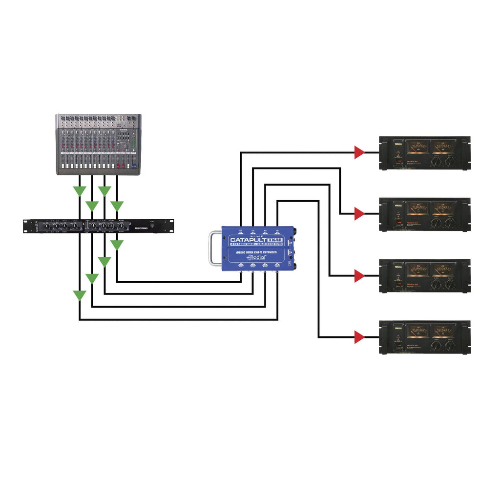 The Catapult is a passive audio snake that allows you to send four channels of analog audio over standard Cat 5 or Cat 6 Ethernet cable.