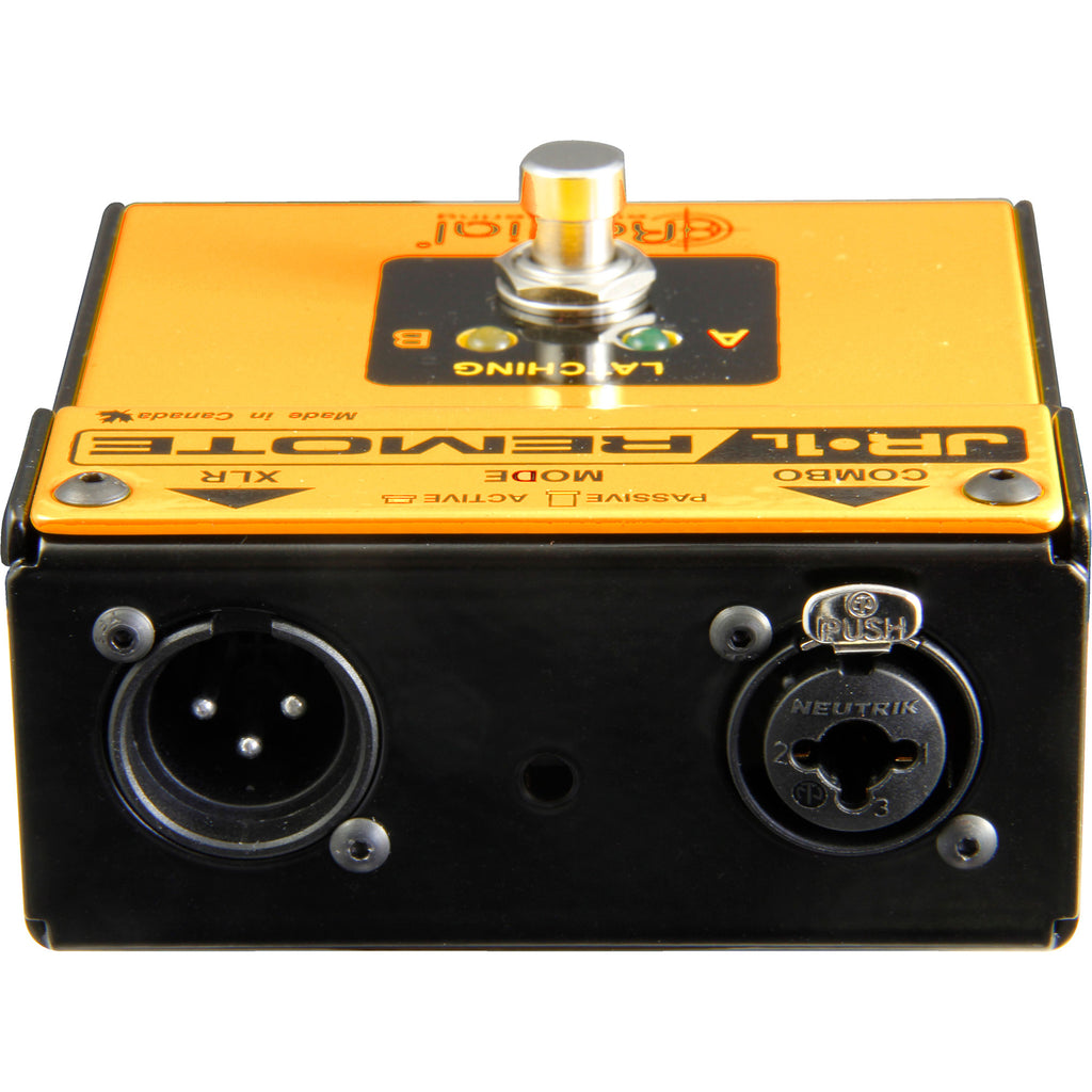 The Radial JR1 is a single action footswitch designed to remotely control a function such as selecting A or B outputs. As a passive device, it does not require any power to make it work. Instead, it employs a simple mechanical switch that shorts the positive with the ground using either 1/4" or XLR connections. The JR1 is available in a 'L' latching version that requires pushing on and pushing off the footswitch to sort and release the contact, or a 'M' momentary version that shorts the contact when depressed, and releases as soon as the switch is released.