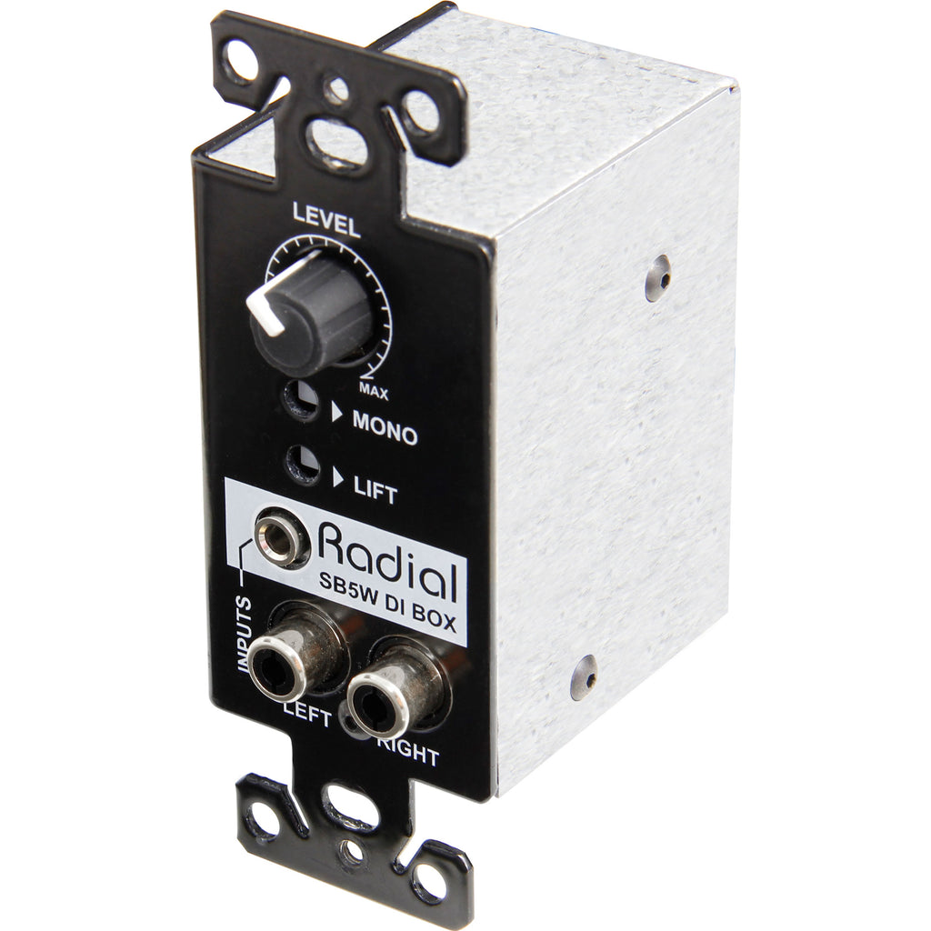 The Radial SB5W is a stereo direct box made to fit in a standard single-gang electrical wall plate. This provides the AV integrator with a simple, yet effective means of connecting an unbalanced analog audio source such as the headphone output from a laptop computer, iPhone, tablet or line level source such as a CD player to a balanced audio system via a permanently mounted interface.