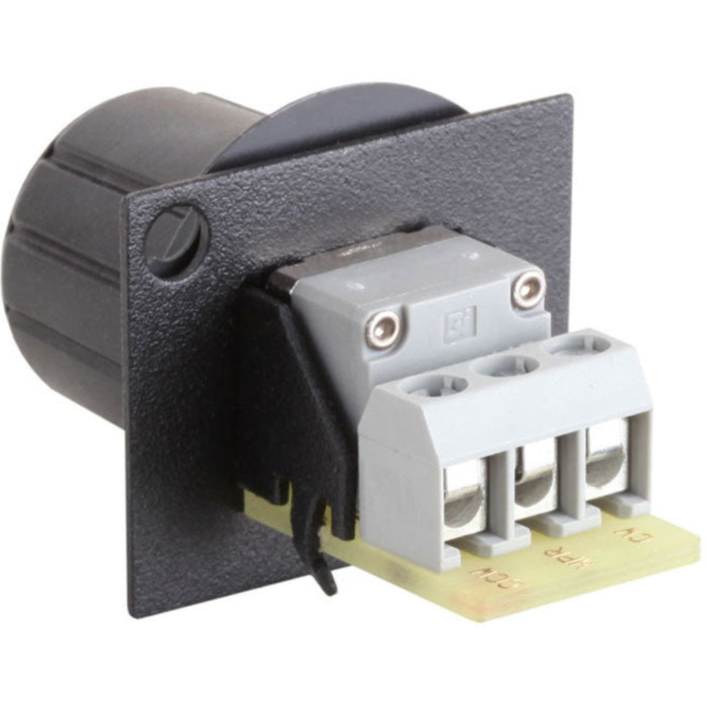 The AMS-10KA is an accessory equipped with a single-turn knob for a user to adjust the audio level. It is designed for the adjustable attenuation of an unbalanced audio signal. The AMS-10KA contains a long-life 10 kΩ audio taper potentiometer for adjusting the audio level. A high quality terminal block is provided for external connections. The AMS-10KA mounts in AMS mounting frames and in standard D-style cutouts. The front plate and bracket are constructed of black satin powder coated steel. A molded black plastic bezel is provided to finish the D-style cutout hole when the accessory is mounted. These accessories are designed to mount behind the front panel of industry products that provide D-style cutouts.