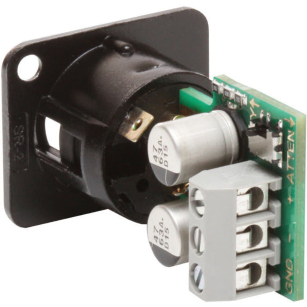 The AMS-XLRMA is a metal male XLR connector equipped with a high quality terminal block for audio connections, a switch-selectable audio attenuator and protection from phantom voltage. The connector mounts in AMS mounting frames and in standard D-style cutouts. The XLR output is equipped with a Unity/Attenuated level switch that provides a nominal 50 dB of attenuation to feed the microphone input of a mixer-amplifier or other equipment with mic inputs. Without attenuation, the AMS-XLRMA may be used solely to block phantom voltage from the mic output of the equipment feeding the AMS-XLRMA terminal block. With attenuation, the AMS-XLRMA provides a phantom-protected mic output for a line-level audio source feeding the AMS-XLRMA.