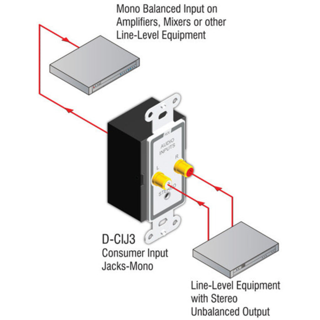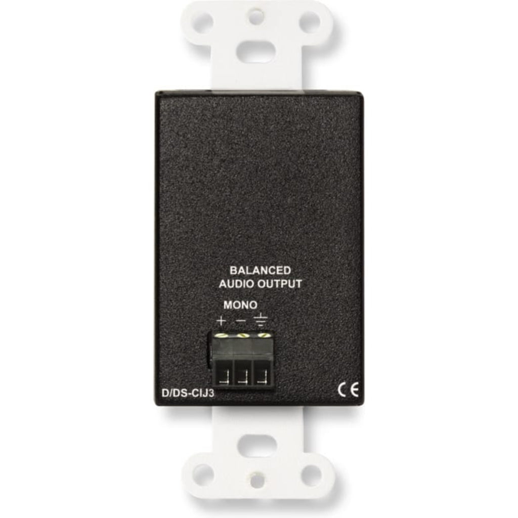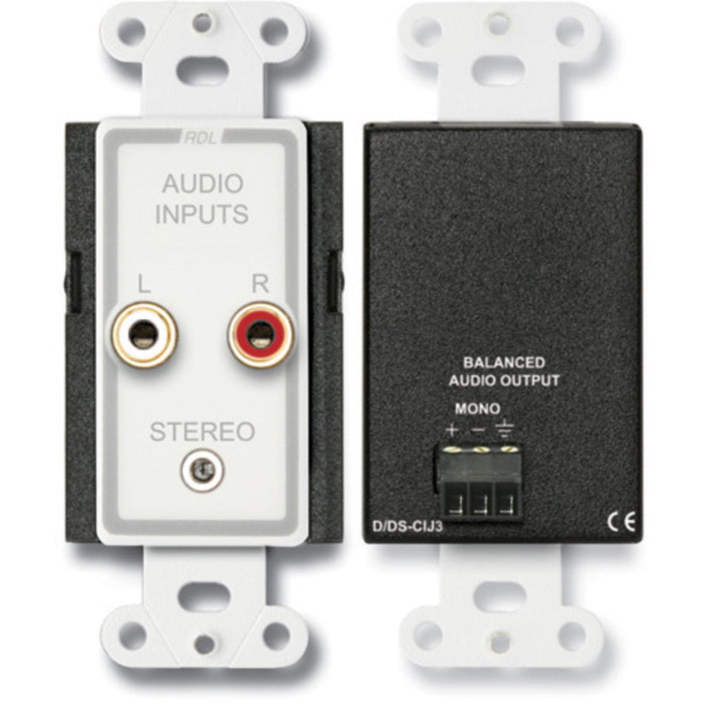 The D-CIJ3/DS-CIJ3 is a complete unbalanced line-level audio input module. The front panel features two gold plated phono jacks and a single stereo mini-jack, intended for mono or stereo consumer level sources. An input signal may be connected to either the phono jacks or to the mini-jack. The left and right signal inputs are combined and balanced through audio transformers configured to reject induced hum. A mono line-level output is provided on the rear-panel detachable terminal block for connection to a 10 kΩ or higher input impedance line-level module or equipment input.