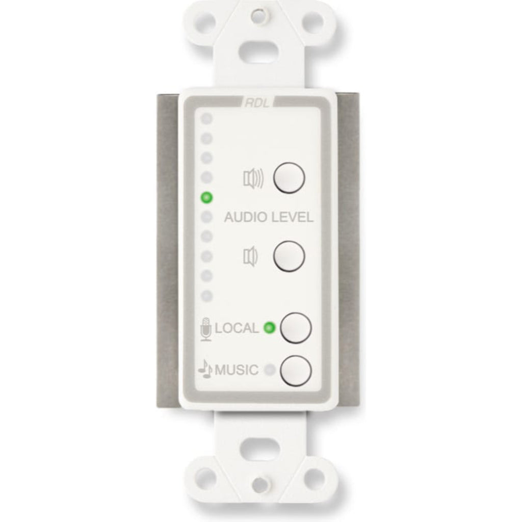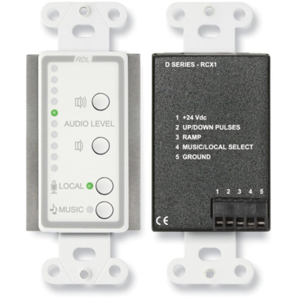 The RDL D-RCX1 Room Control features pushbutton UP/DOWN volume adjustment, and pushbutton selection between MUSIC and LOCAL (microphones and/or line level inputs). This standard RCX remote control mounts in an RDL WB-1U Wall Box.