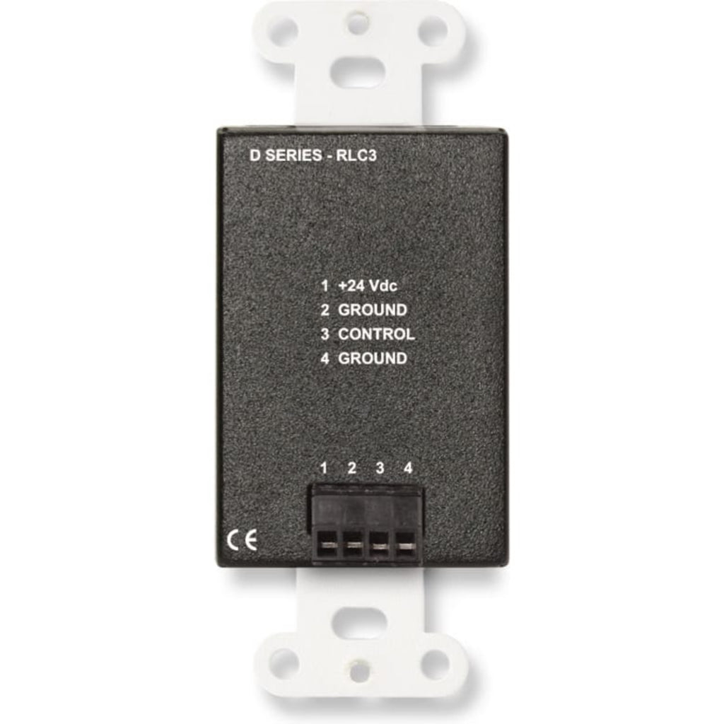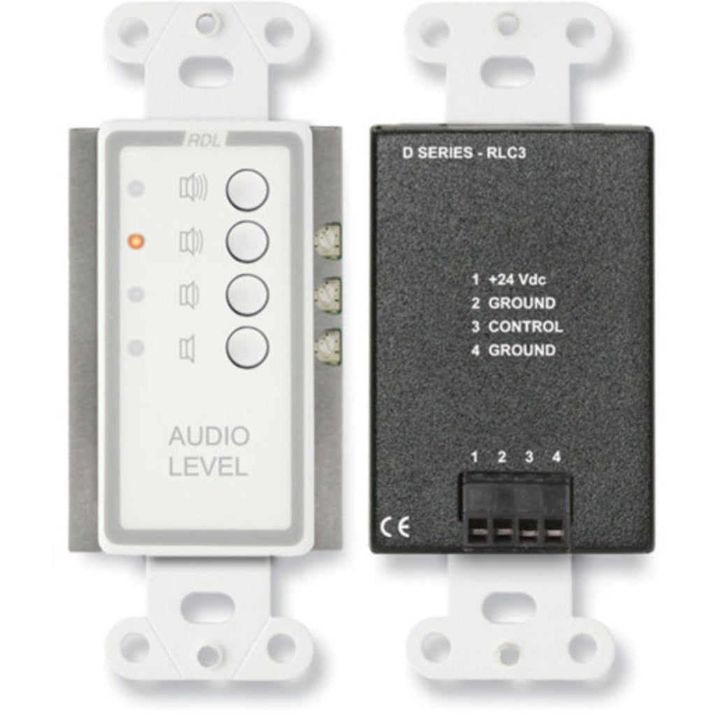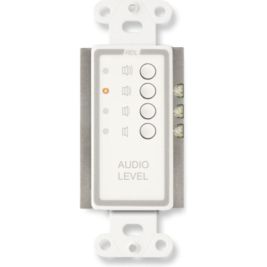 The DB-RLC3 is designed to directly interface with RDL control modules which feature a 0 to 10 Vdc control input utilizing an external 10 kΩ resistive control, such as the ST-VCA3, RU-VCA2 and RU-VCA2D voltage controlled amplifiers. The DB-RLC3 has four momentary pushbuttons, each corresponding to one of four levels selected.