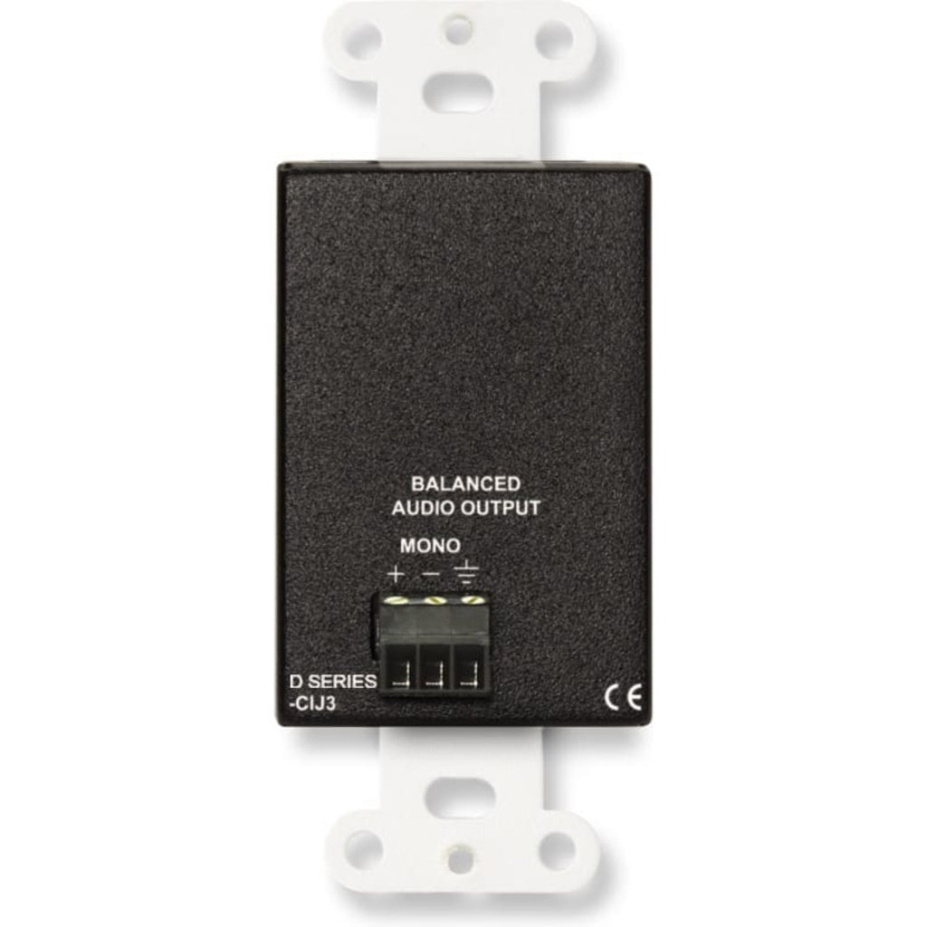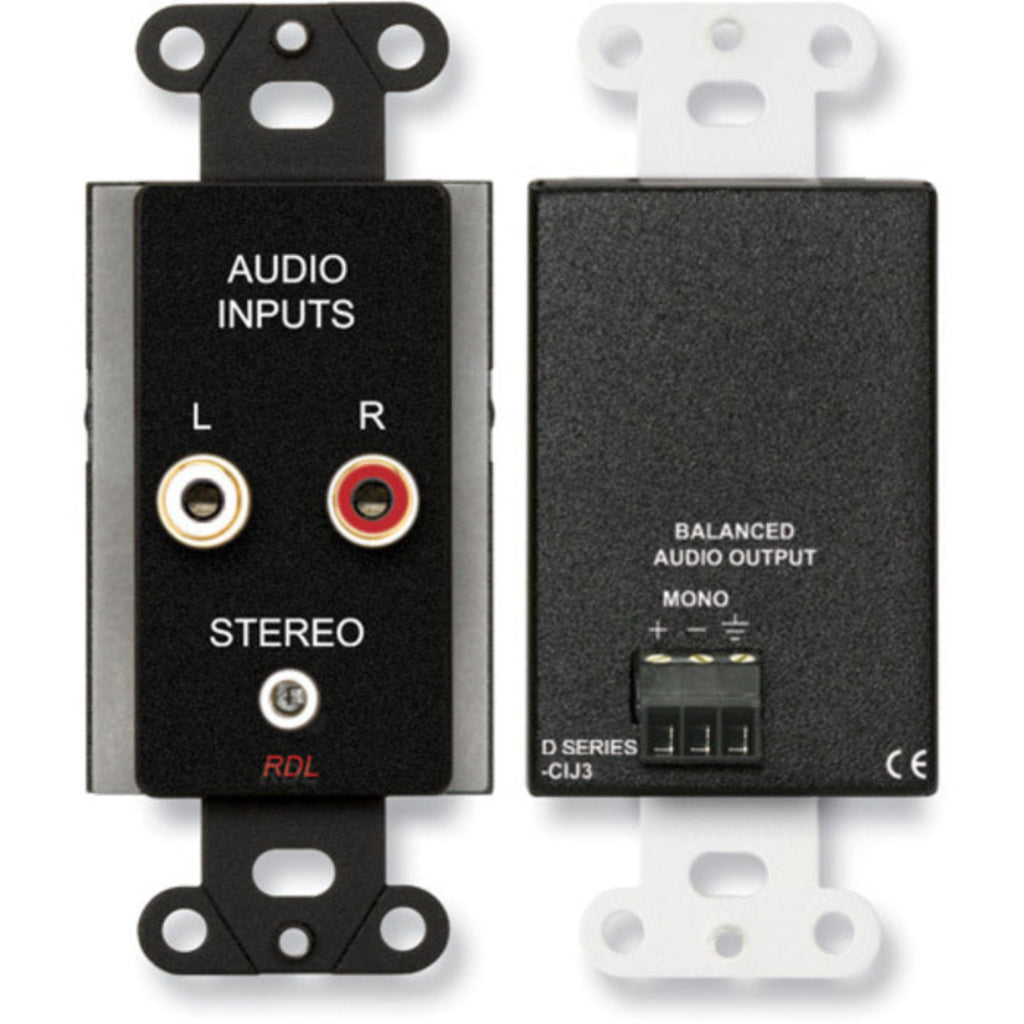 The D/S-CIJ3 is a complete unbalanced line-level audio input module. The front panel features two gold plated phono jacks and a single stereo mini-jack, intended for mono or stereo consumer level sources. An input signal may be connected to either the phono jacks or to the mini-jack. The left and right signal inputs are combined and balanced through audio transformers configured to reject induced hum. A mono line-level output is provided on the rear-panel detachable terminal block for connection to a 10 kΩ or higher input impedance line-level module or equipment input.