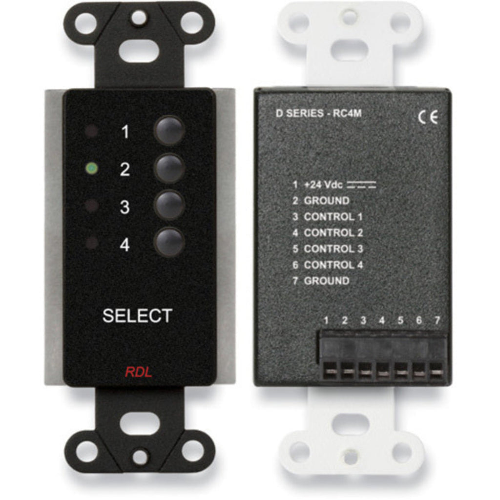 The D SERIES-RC4M is a remote control that provides source selection at single or multiple locations. The -RC4M is designed to directly connect to an RDL 4-channel switching module controlled by external momentary pushbuttons. The front panel of the -RC4M features four pushbuttons, each corresponding to one of four inputs. An LED adjacent to each button shows which source is selected. When an -RC4M is not being used, its display switches to a dim intensity to avoid being a visual distraction. The display returns to a bright intensity when a button is pushed.